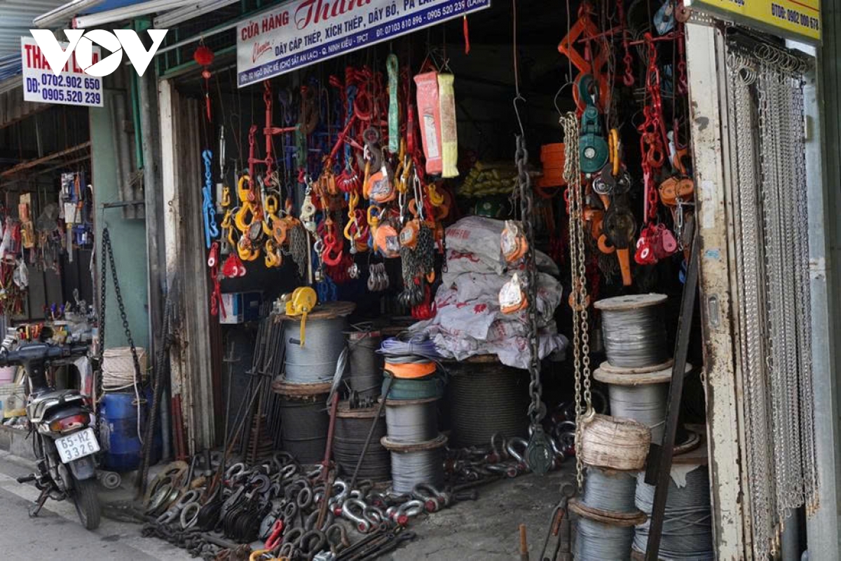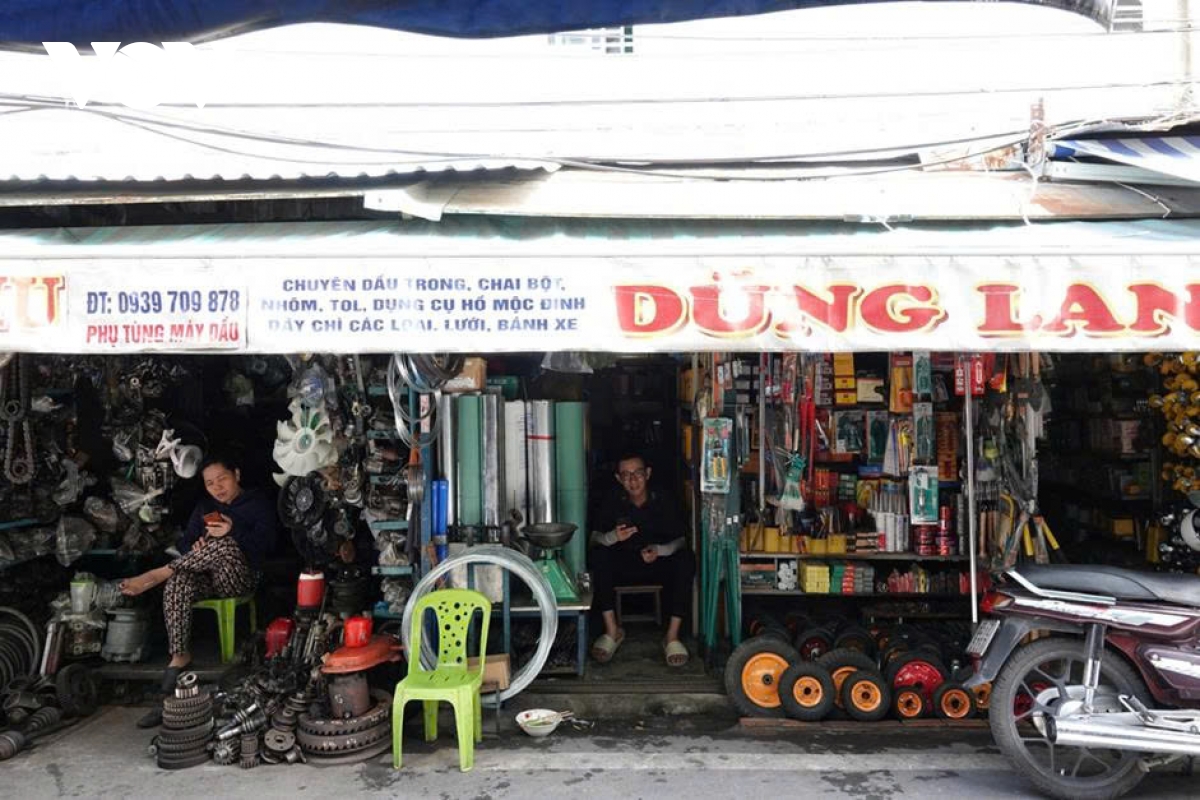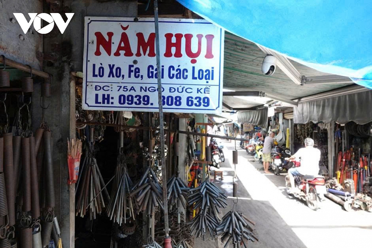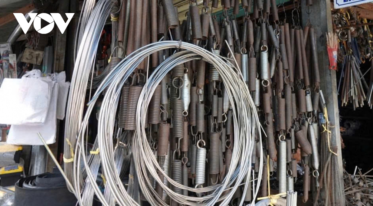 Những cuộn lò xo thép đủ kích cỡ, từ mảnh như sợi tóc đến loại to dùng cho máy móc công nghiệp, được treo thành từng chùm, trông như những “trái cây bằng kim loại”. Cách bày biện phần nào cho thấy sự phong phú và chuyên biệt của hàng hóa nơi đây.