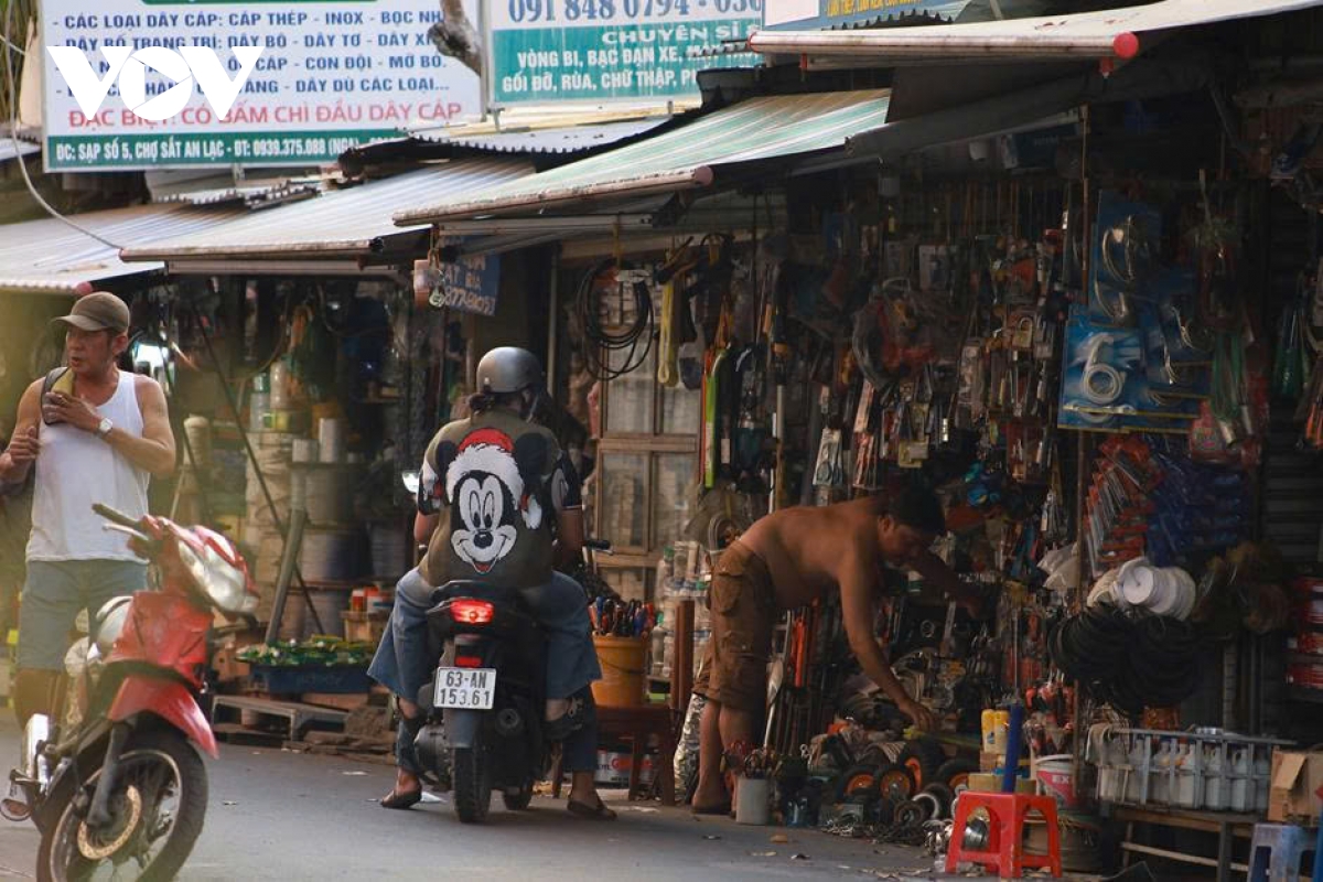 Giữa những sạp sắt thép nặng nề vẫn hiện rõ nhịp sinh hoạt quen thuộc. Khách mua hàng chạy xe máy vào tận nơi, dừng lại hỏi giá, lựa đồ rồi lại đi, mọi thứ diễn ra tự nhiên như một khu chợ dân sinh lâu năm.