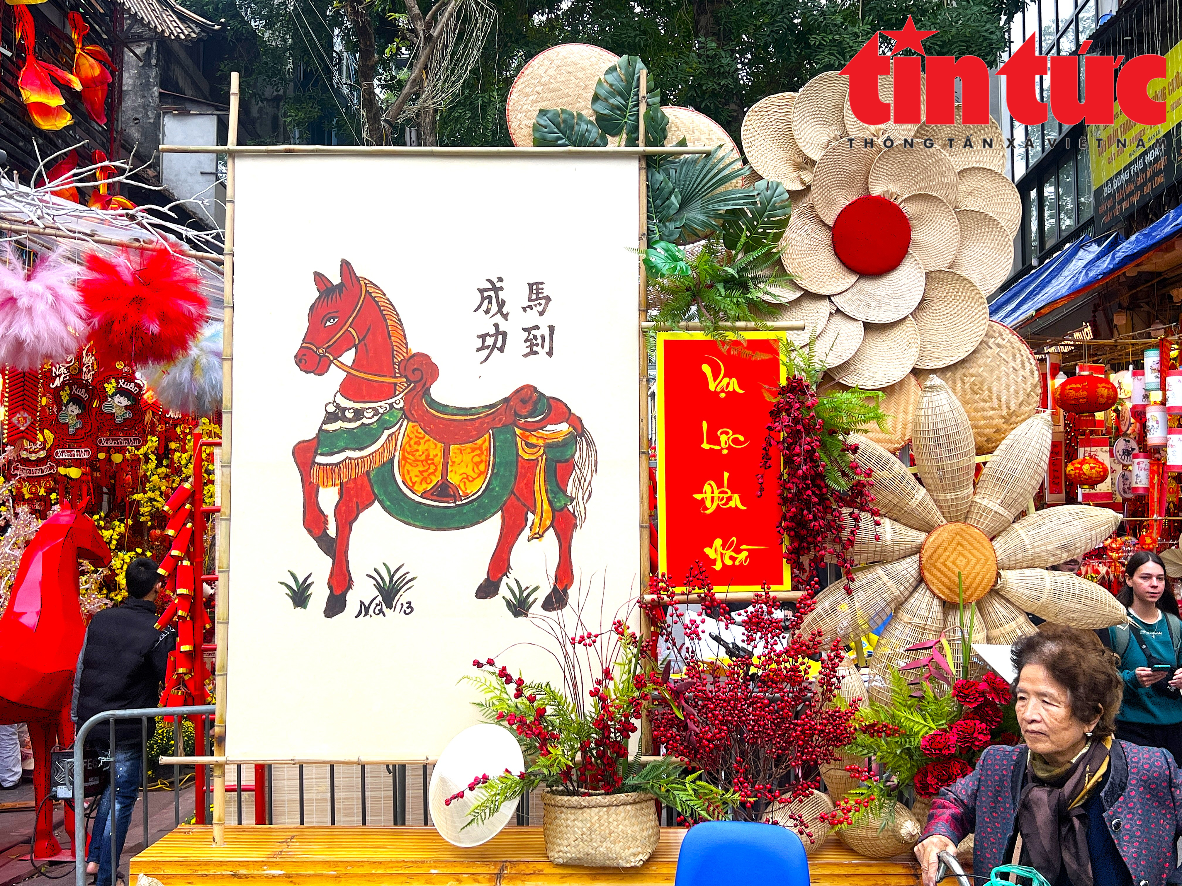 Chợ hoa xuân Hàng Lược bày bán đa dạng các mặt hàng thủ công truyền thống gắn với linh vật năm nay là con ngựa.
