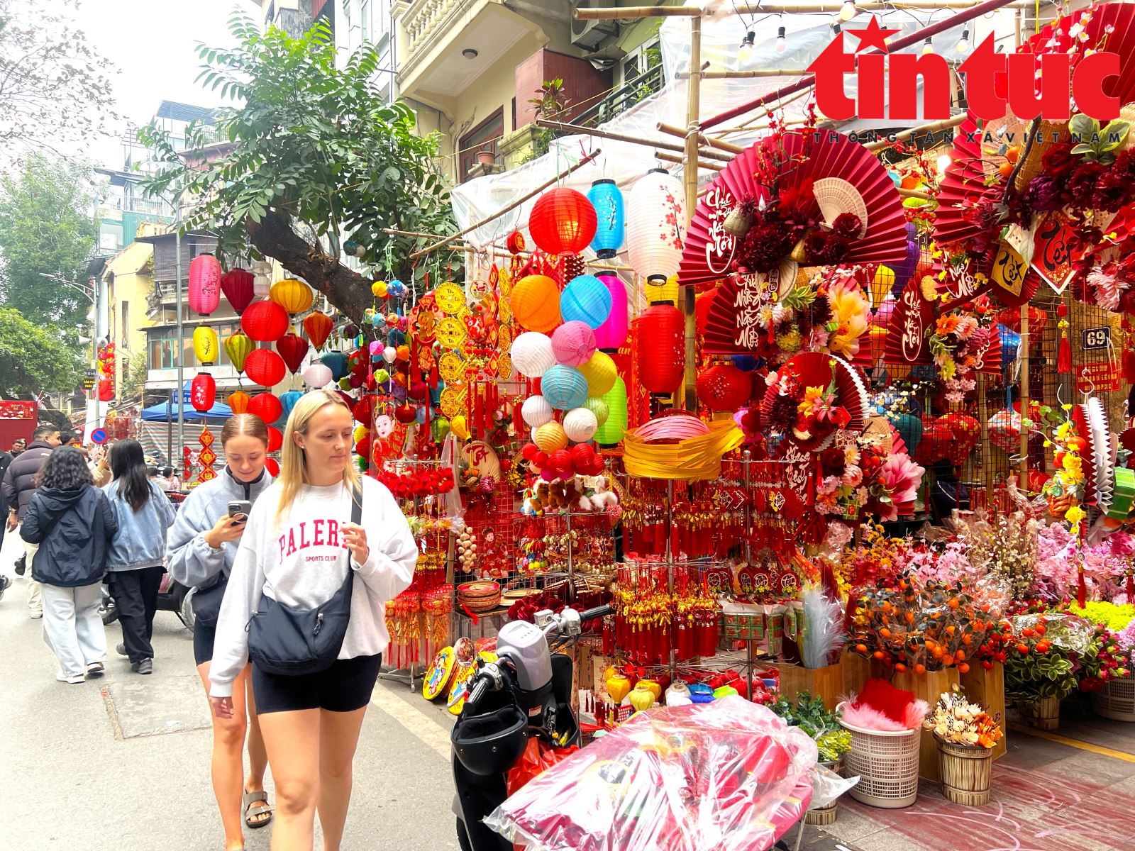 Du khách quốc tế hào hứng trải nghiệm văn hóa Tết cổ truyền Việt Nam trong không gian phố cổ Hà Nội.