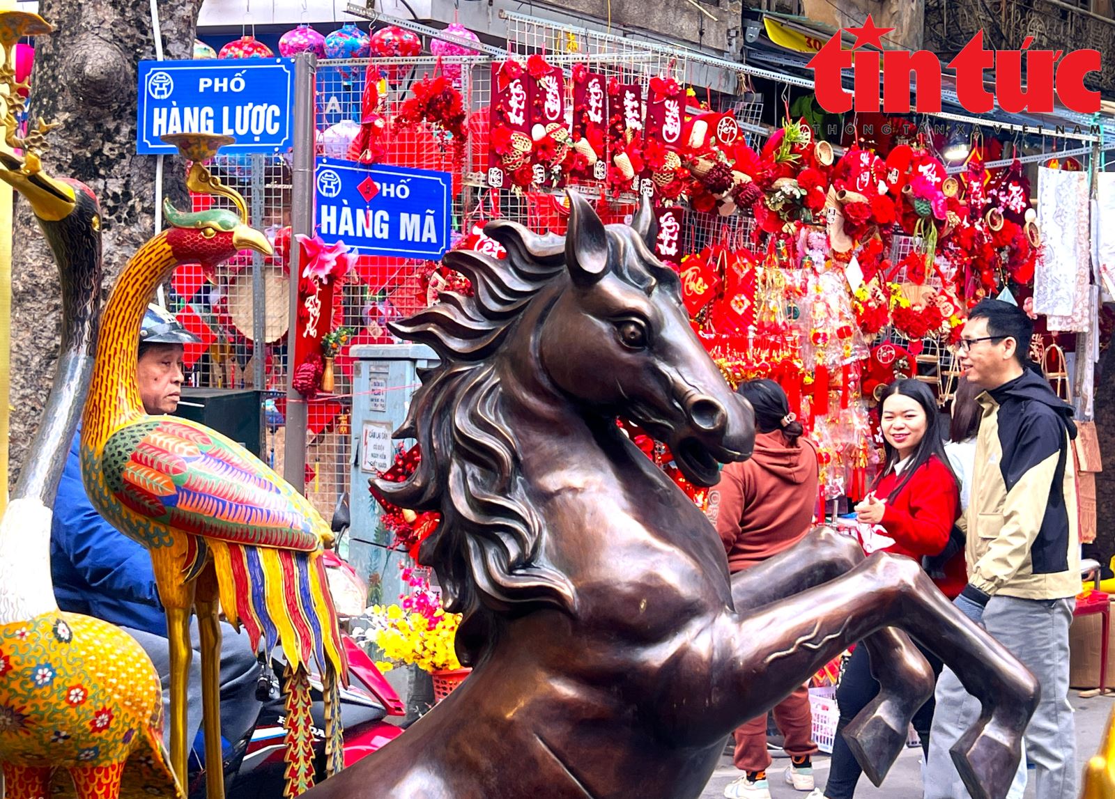 Cách đó không xa, phố Hàng Mã cũng là điểm đến thu hút giới trẻ và các gia đình dịp Tết đến, xuân về. Cả con phố được bao phủ bởi sắc đỏ, vàng rực rỡ của đèn lồng, câu đối, bao lì xì, đồ trang trí Tết và linh vật ngựa. Không chỉ mua sắm, nhiều người còn tranh thủ chụp ảnh, check-in giữa không gian ngập tràn sắc xuân, ghi lại những khoảnh khắc đáng nhớ trước thềm năm mới.
