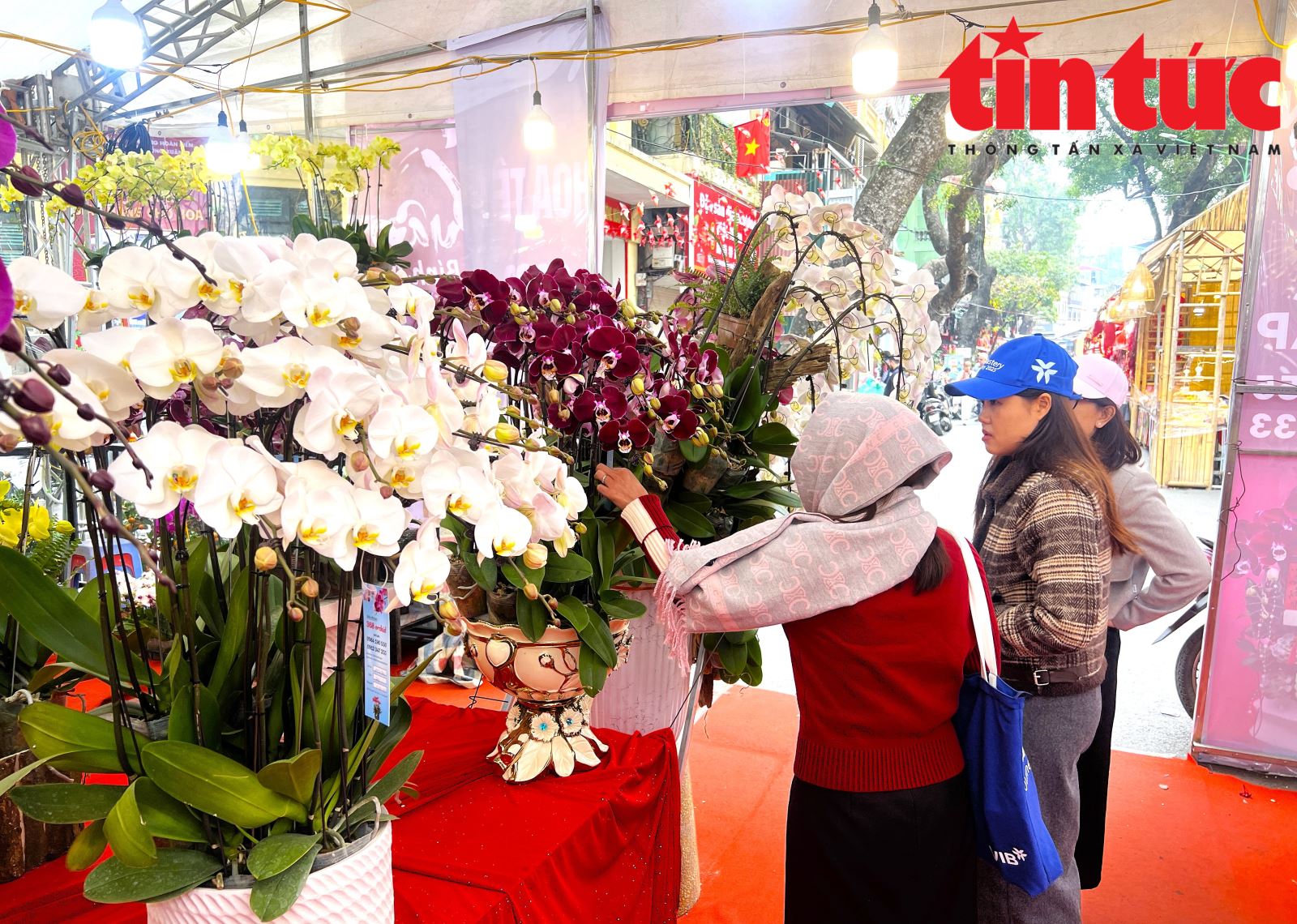 Khách hàng đến chợ hoa xuân Hàng Lược để chọn hoa lan trưng Tết hoặc làm quà biếu, mỗi chậu có giá từ vài triệu đến cả chục triệu đồng.