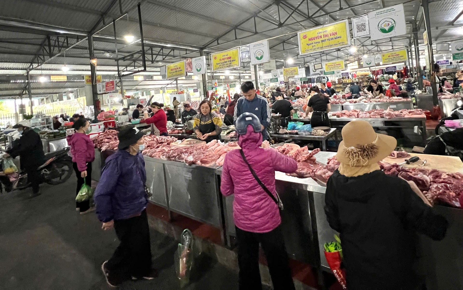 Khu vực thịt gia súc, gia cầm là nơi nhộn nhịp nhất. Thịt lợn, đặc biệt là ba chỉ, sườn, thịt vai, tai – lưỡi, móng giò được mua nhiều hơn cả. Chị Phạm Thị Lý, tiểu thương tại chợ Thượng Thanh cho biết, từ sau ngày 23 tháng chạp, nhiều gia đình bắt đầu gói bánh chưng, làm giò xào nên lượng thịt bán ra tăng mạnh. “Ba chỉ, tai, lưỡi thường hết sớm. Có hôm mới hơn 8-9 giờ đã hết sạch”, chị Lý nói.