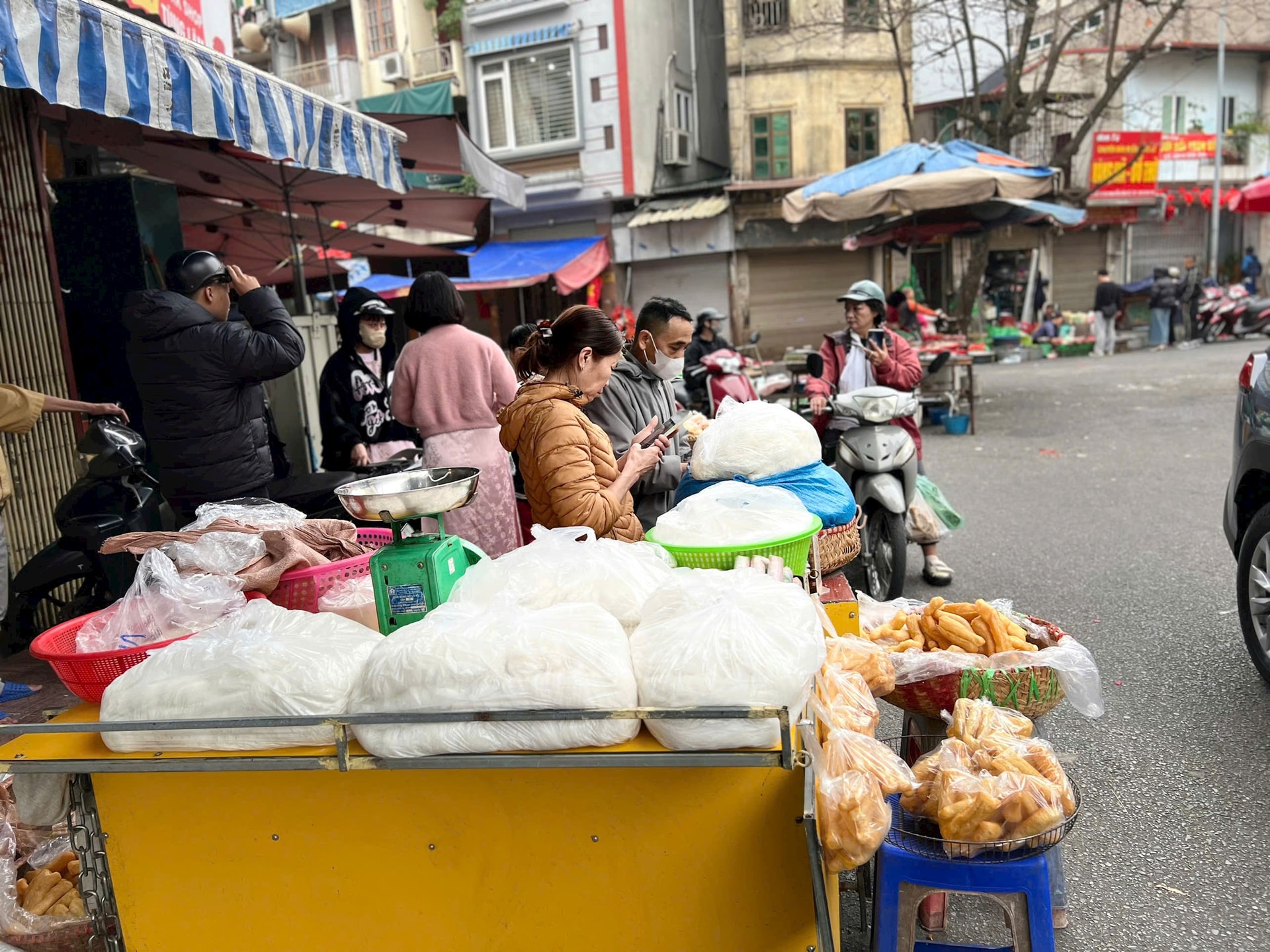 Hàng bún phở tại chợ Gia Lâm (phường Bồ Đề) trong ngày mùng 5 Tết. Ảnh: L.G