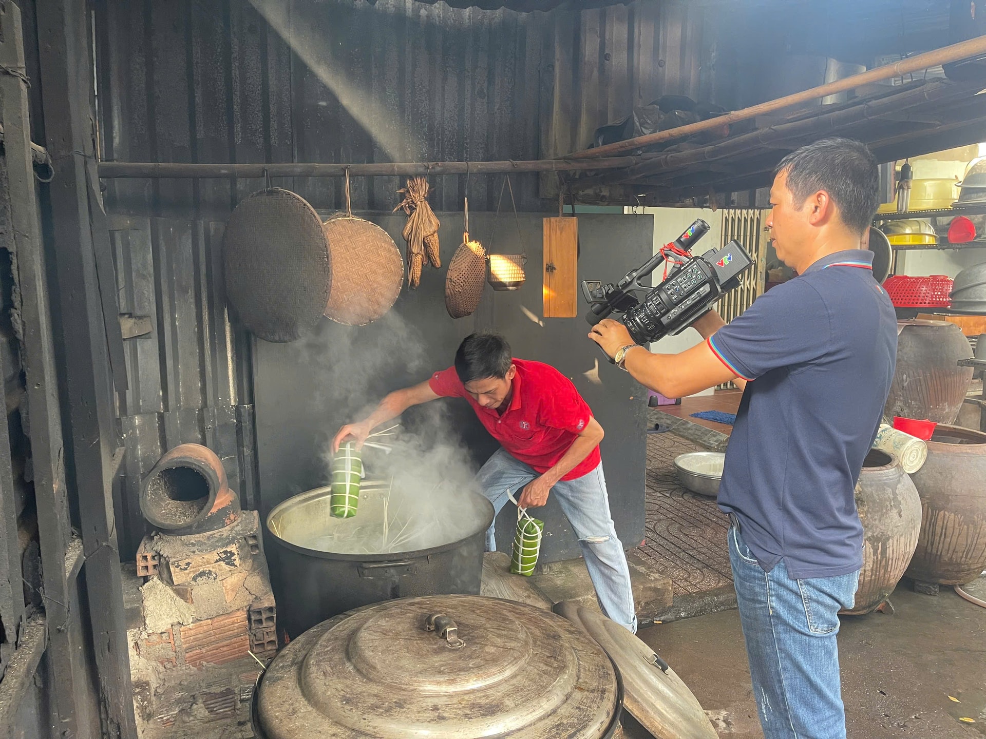 Ekip cùng thức đêm canh nồi bánh tét với những người thợ làm bánh.