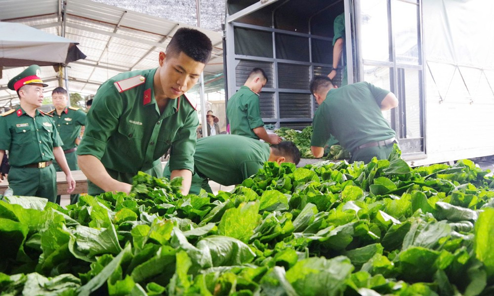 Các chiến sĩ quân đội vận chuyển rau xanh đến “Phiên chợ 0 đồng – San sẻ yêu thương” để trao tặng người dân xã Tiên Lục.