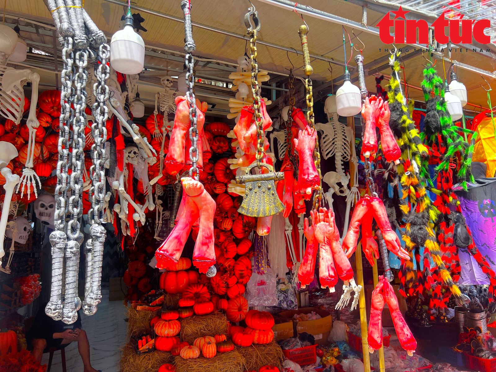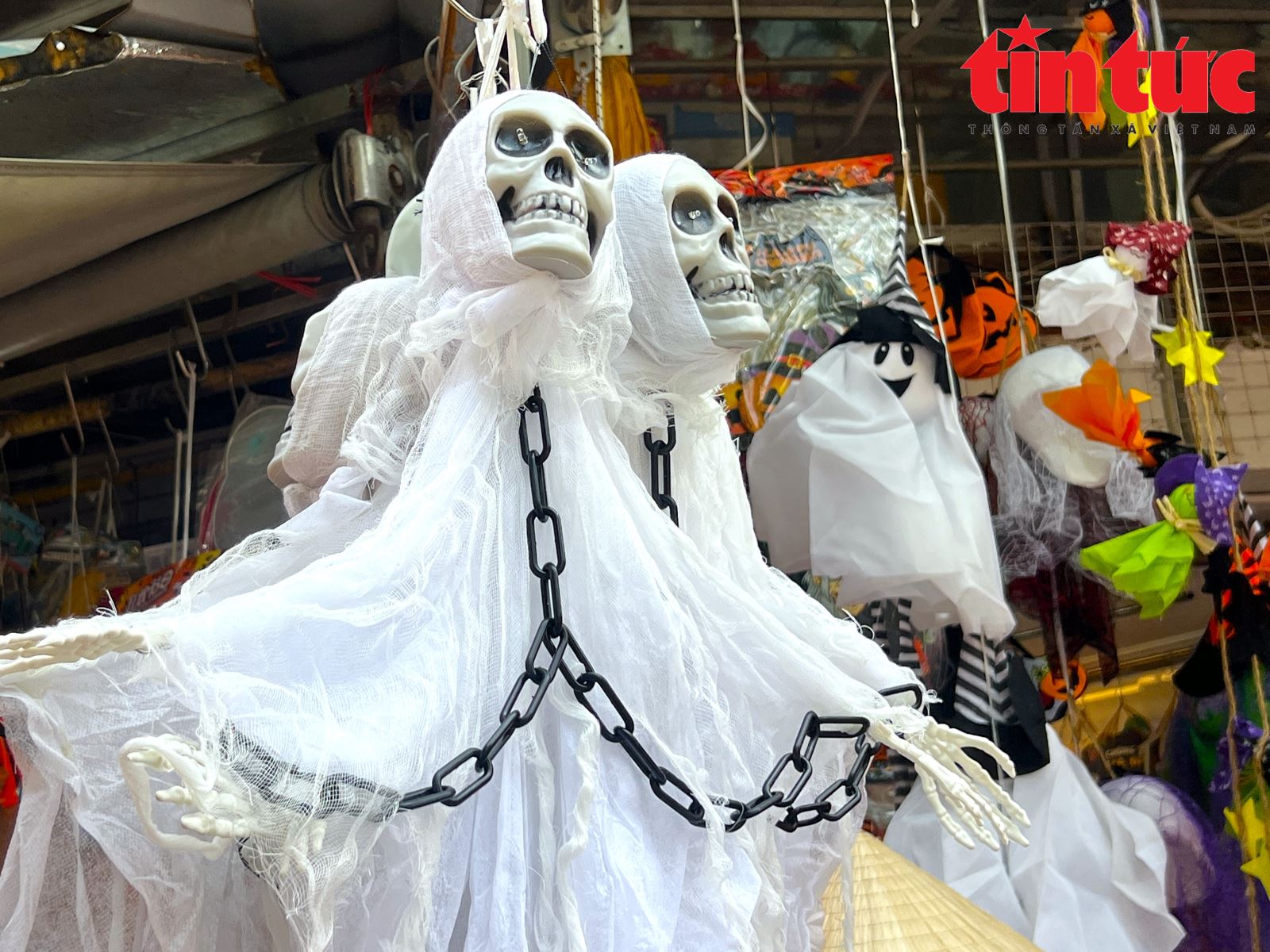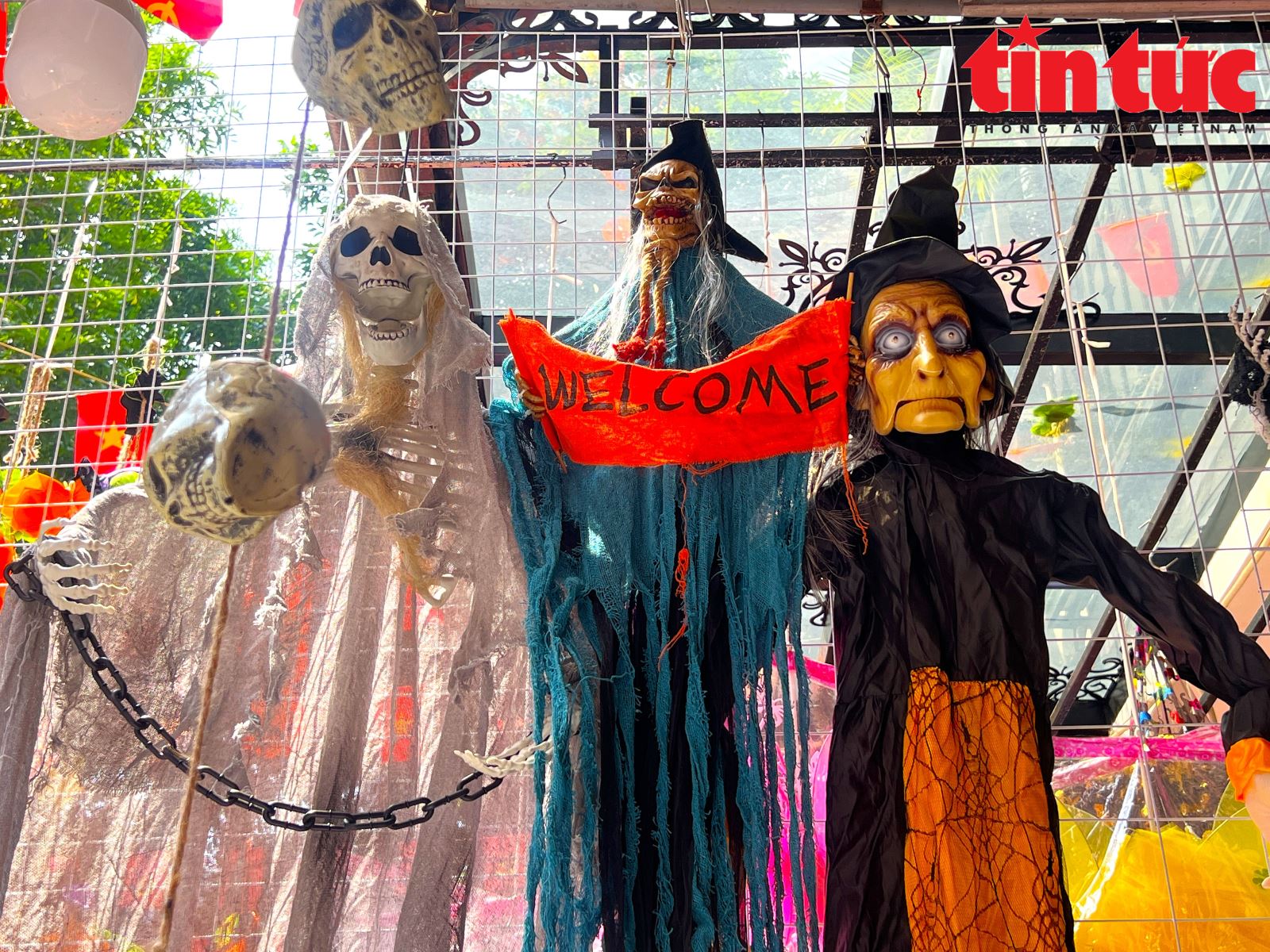 Các gian hàng bày biện, trang trí nhiều mô hình đầu lâu, xương, xích, đèn bí ngô... khiến không gian phố Hàng Mã đầy "ma mị".