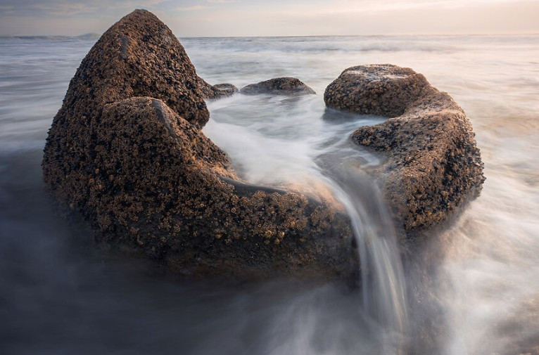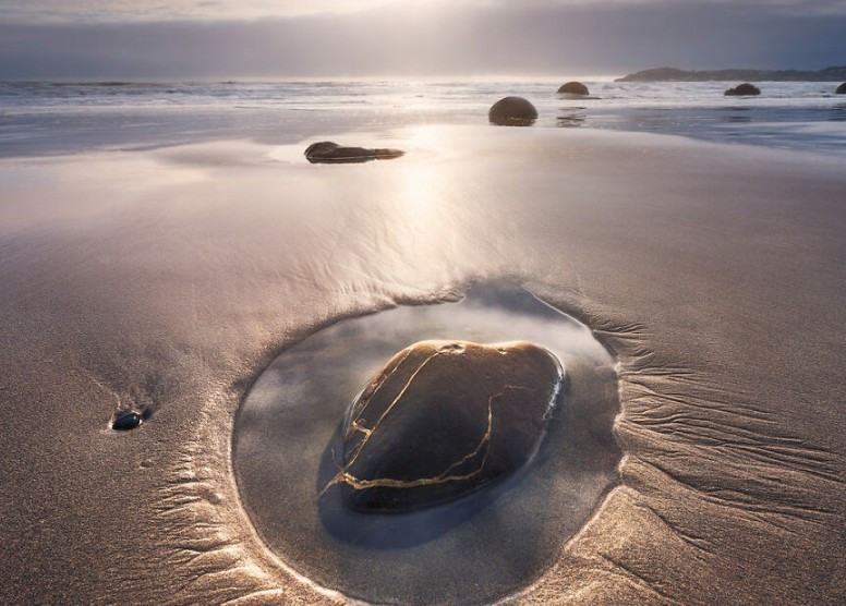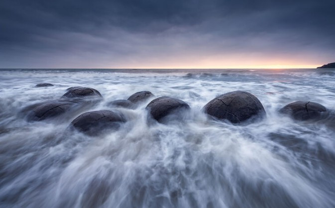 Những khối đá Moeraki nổi tiếng lúc bình minh. Những khối đá hình cầu khổng lồ này, được hình thành từ đá trầm tích cổ đại cách đây hàng chục triệu năm, nằm trên bãi biển Koekohe thuộc bờ biển Otago.