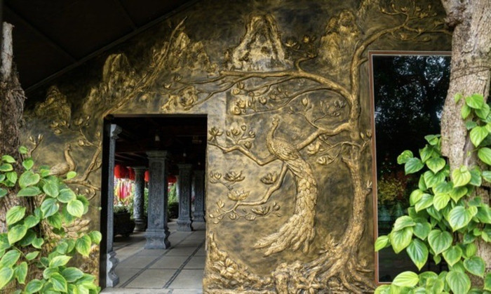 Nhiều mặt tường của điện thờ được đắp tranh phù điêu theo chủ đề