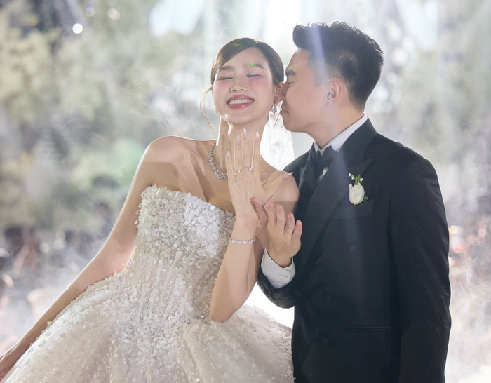 Đỗ Thị Hà cùng ông xã khoe nhẫn cưới trong hôn lễ. (Nguồn: Linh Le Chi)