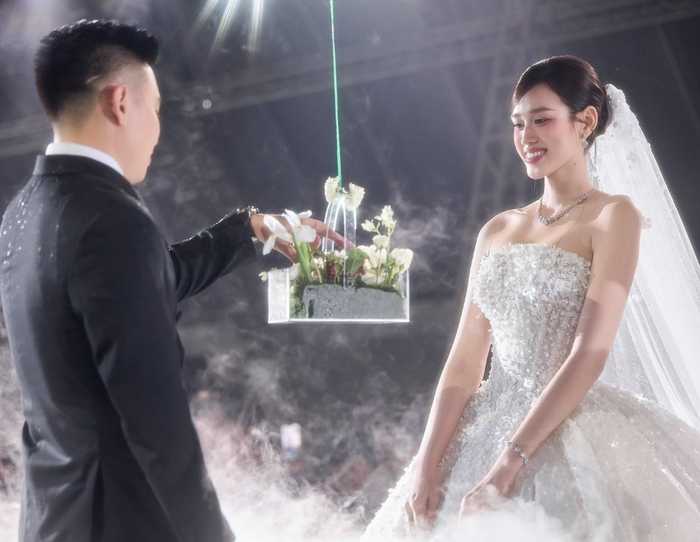 Màn trao nhẫn được dàn dựng công phu, thể hiện sự chỉn chu và ý nghĩa trong từng chi tiết. Cặp nhẫn cưới được đặt trong chiếc hộp phủ đầy hoa tươi, hạ xuống từ trên cao trong ánh sáng dịu nhẹ, tượng trưng cho tình yêu đơm hoa kết trái.