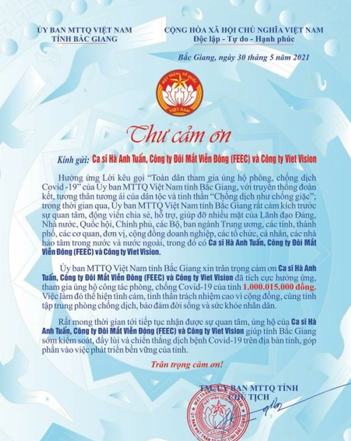 Một bức thư cảm ơn từ tỉnh Bắc Giang gửi đến ca sĩ Hà Anh Tuấn.