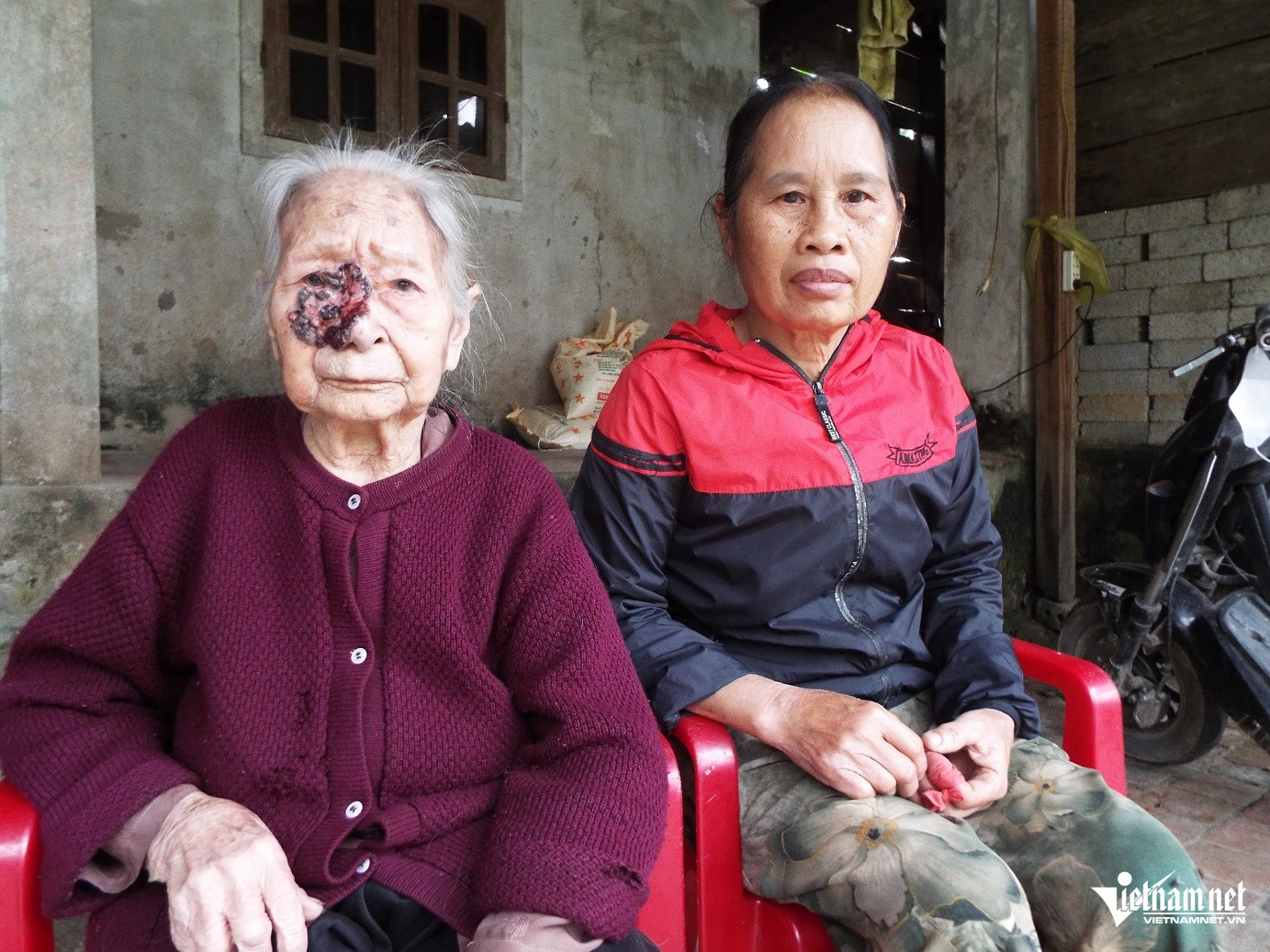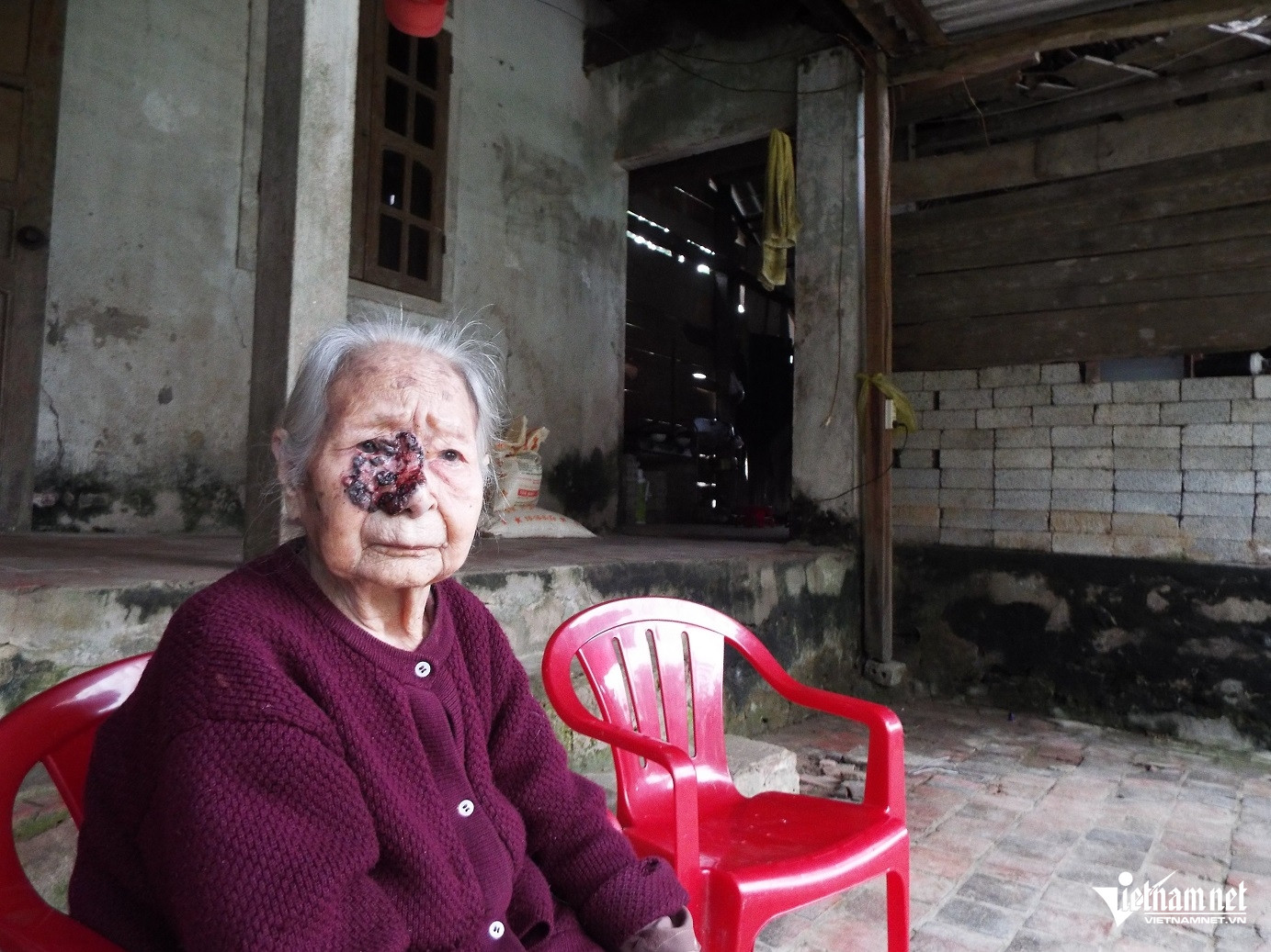 Cụ Phạm Thị Loan (93 tuổi) mang khối u lở loét trên mặt nhưng không có tiền chạy chữa, thăm khám. Ảnh: Sỹ Thông