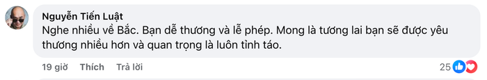Theo đó, Tiến Luật viết: "Nghe nhiều về Bắc. Bạn dễ thương và lễ phép. Mong là tương lai bạn sẽ được yêu thương nhiều hơn và quan trọng là luôn tỉnh táo".