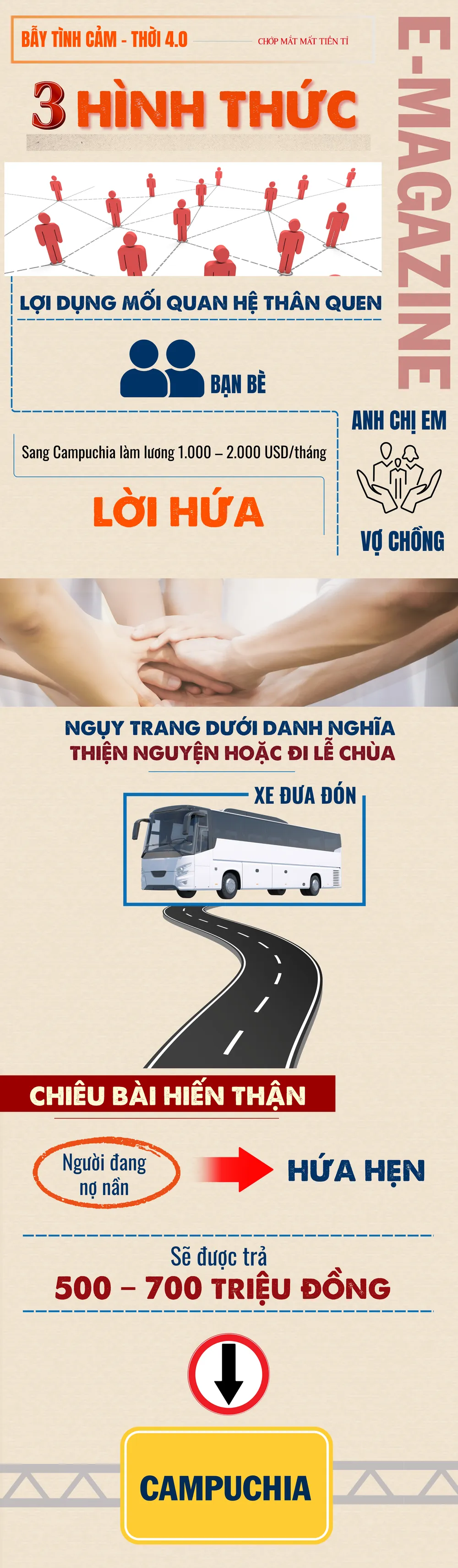 Những “nhà máy cảm xúc” như vậy hoạt động kiểu dây chuyền: kẻ “làm quen”, người “chốt nạp”, người hóa thân thành nhân viên app, người đóng vai quản trị nhóm, và cả bộ phận “giải cứu” giả danh luật sư hoặc điều tra viên - đúng như hai nạn nhân ở phần đầu đã đề cập. Tất cả nhằm tối đa hóa thời gian tương tác với nạn nhân và tăng xác suất chuyển tiền.