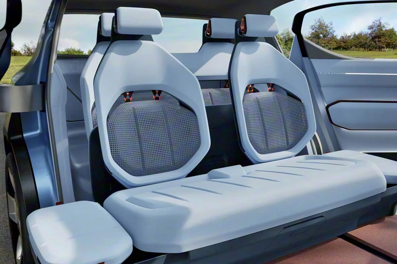 Khoang nội thất của Kia EV2 được thiết kế theo phong cách tối giản tinh tế, tập trung vào trải nghiệm người dùng. Nổi bật là màn hình kép nối liền phía trước vô-lăng hai chấu, hệ thống ghế liền khối cùng thiết kế loại bỏ hoàn toàn bệ tỳ tay trung tâm, tạo cảm giác rộng rãi và liền mạch. Đệm ghế sau có thể nâng lên linh hoạt, kết hợp với thanh trượt hàng ghế trước kéo dài, giúp tận dụng tối đa không gian chứa đồ.