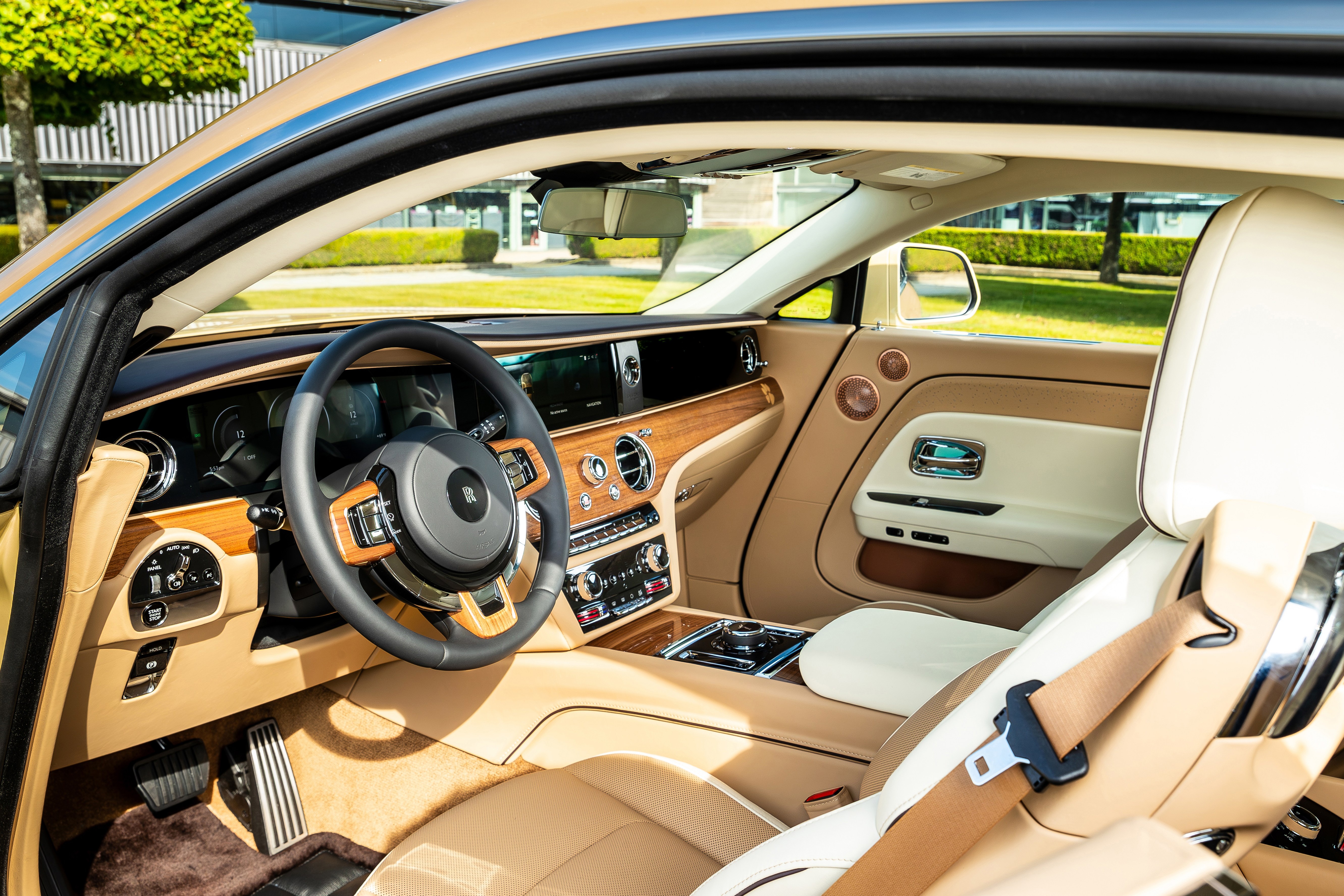 Nội thất của Rolls-Royce Spectre Bailey được bọc da Moccasin và Crème Light, kết hợp với các điểm nhấn màu Dark Spice và Casden Tan, gợi nhớ đến màu lông của Bailey.