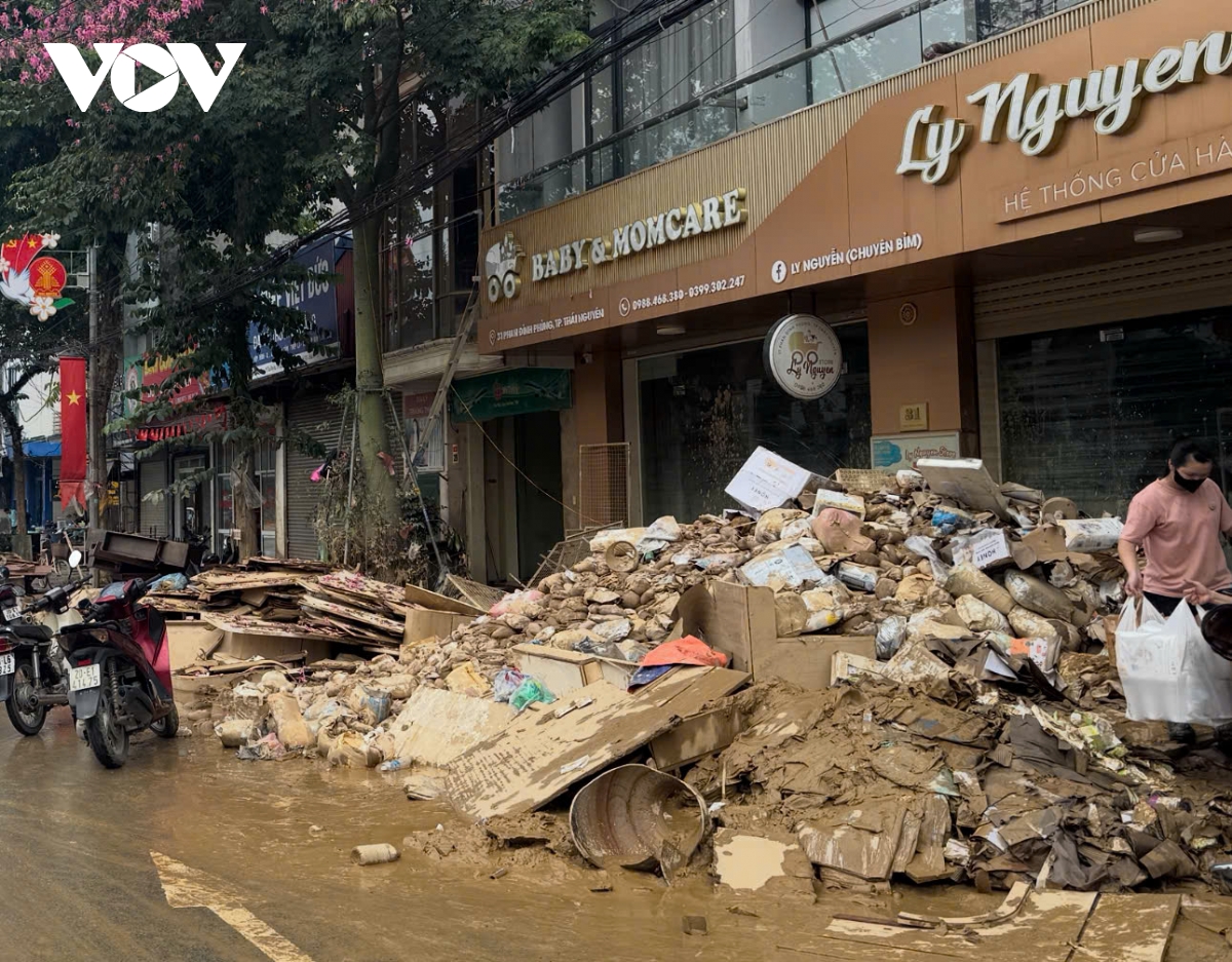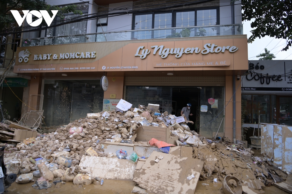 Mấy ngày hôm nay chị Nguyễn Ly ở số nhà 31 phố Phan Đình Phùng, phường Phan Đình Phùng, Thái Nguyên cứ ngồi bần thần trên tầng 2, không muốn xuống tầng 1 nhà mình. Vì dưới đó mới mấy hôm trước là môt của hàng bán đồ sữa, bỉm và đồ trẻ em lớn nhất nhì Thái Nguyên. Cửa hàng là tiền bạc và công sức của bố me 2 bên hỗ trợ và quá trình tích cóp gần chục năm đã hư hỏng theo con nước lũ.