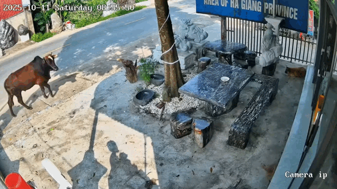 Lúc này, chủ cửa hàng đang ngồi ở một góc, cúi gằm mặt xuống và mải mê với chiếc điện thoại di động, hoàn toàn không hề hay biết về sự xuất hiện của "vị khách" khổng lồ này. Mãi đến khi chú bò di chuyển đến gần, ông chủ mới giật mình ngước lên.
