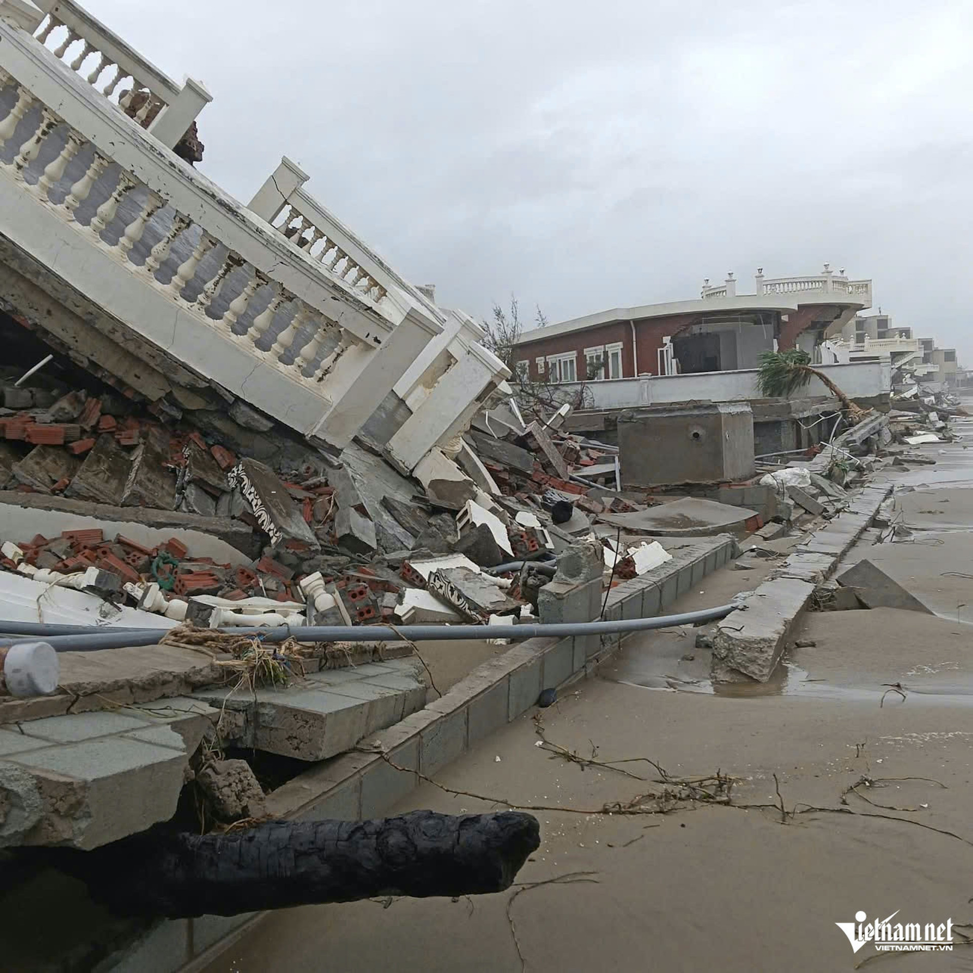 Tuy nhiên, sau bão số 10 Bualoi, toàn bộ dãy villa hướng biển đều bị ảnh hưởng nặng nề. Nhiều căn bị gió bão quật sập, vỡ nát, không còn giữ được kiến trúc ban đầu. Hình ảnh từ hiện trường cho thấy phần mái, tường, móng bị xé toang, nền bị xói lở.