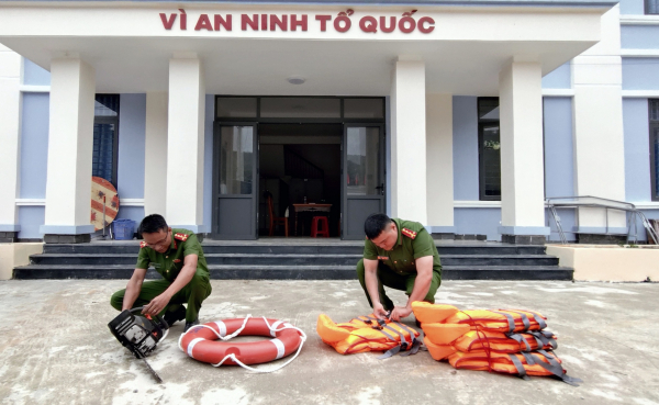 Cán bộ Công an xã Phước Thành chuẩn bị trang thiết bị để sẵn sàng ứng phó mưa lũ, sạt lở đất.