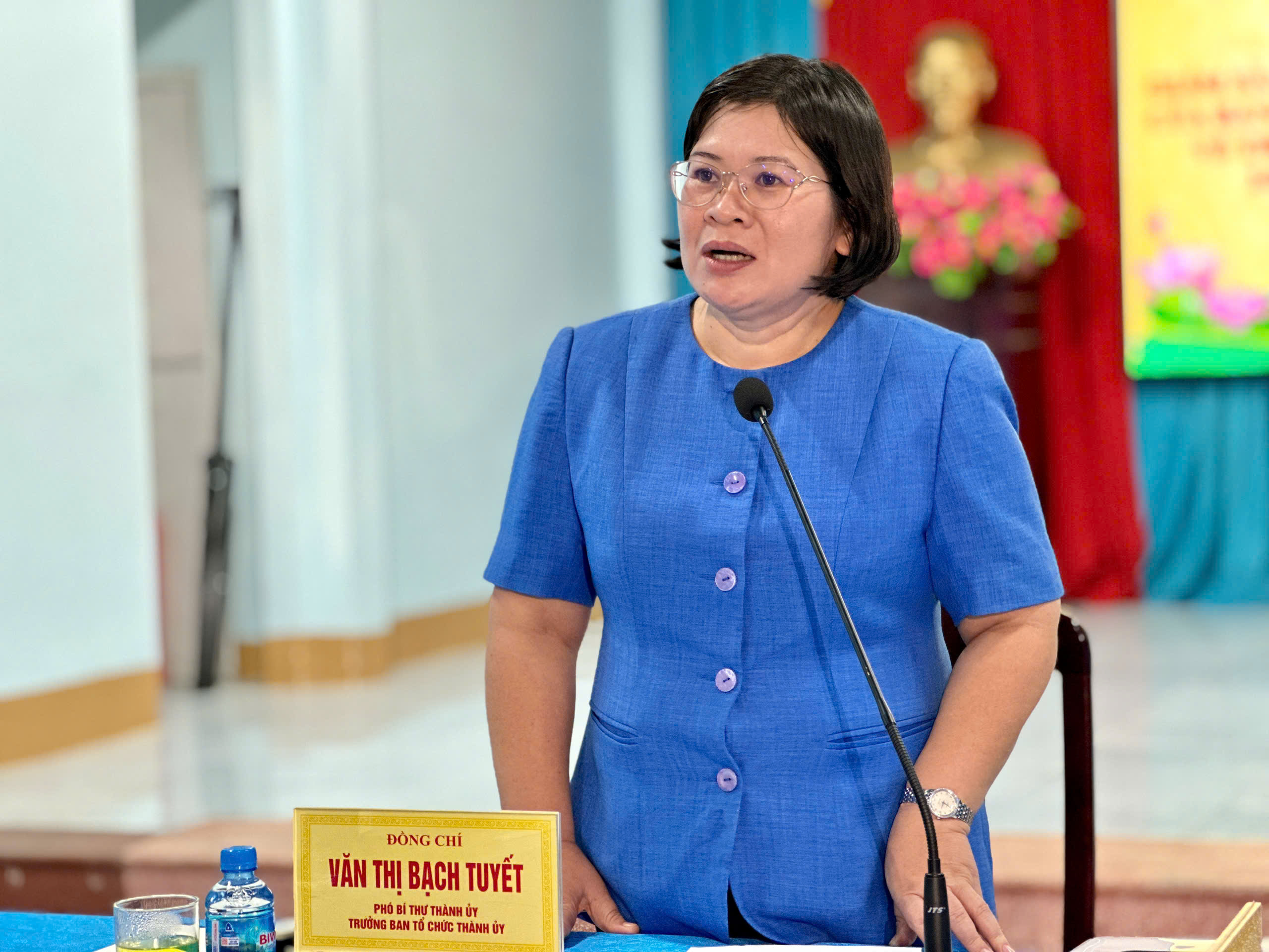Đồng chí Văn Thị Bạch Tuyết phát biểu tại buổi làm việc với Đảng ủy xã Phú Giáo và xã Phước Hòa