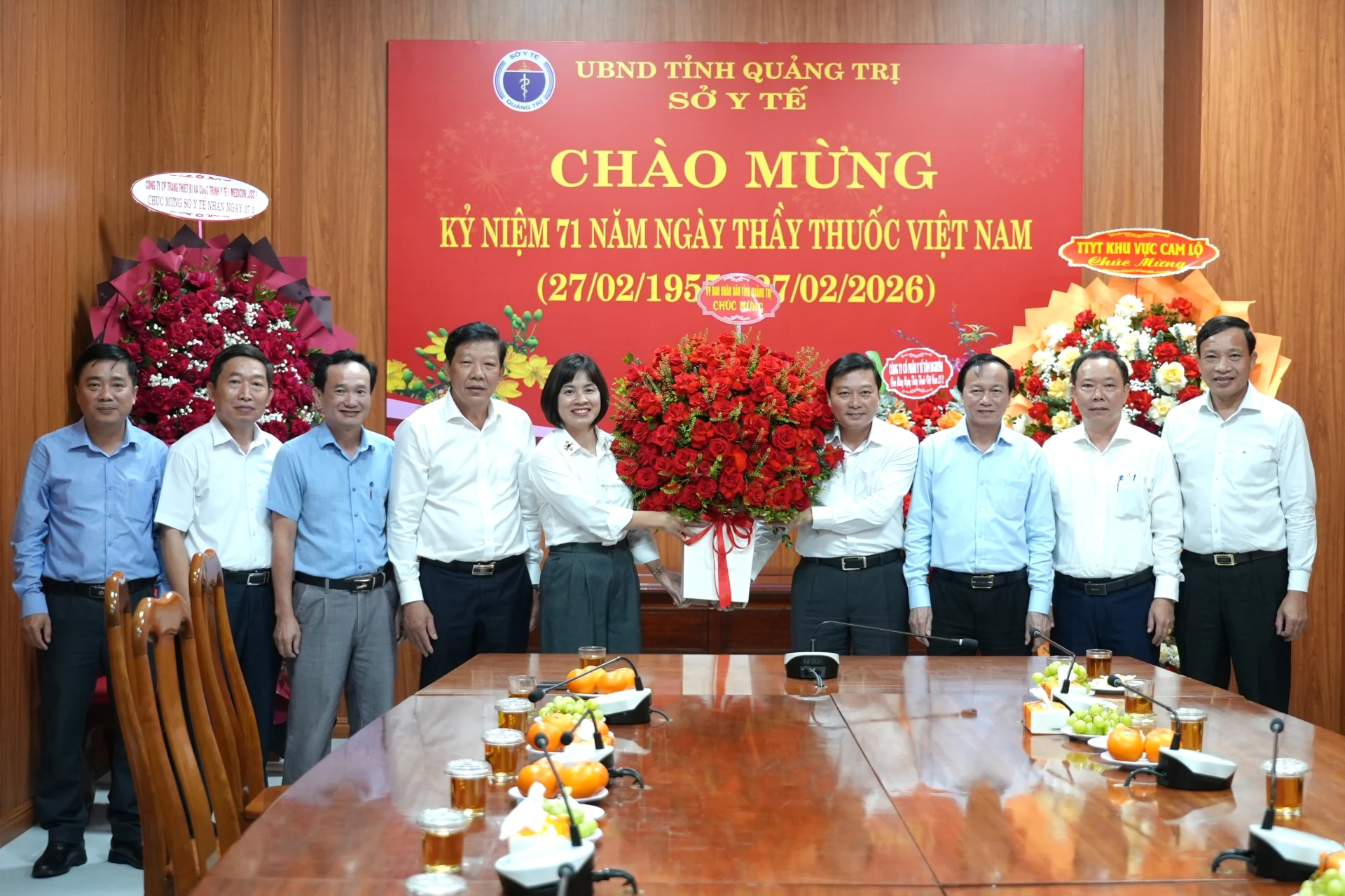 Đồng chí Chủ tịch UBND tỉnh Lê Hồng Vinh tặng hoa, chúc mừng lãnh đạo Sở Y tế nhân kỷ niệm 71 năm Ngày Thầy thuốc Việt Nam - Ảnh: T.Đ