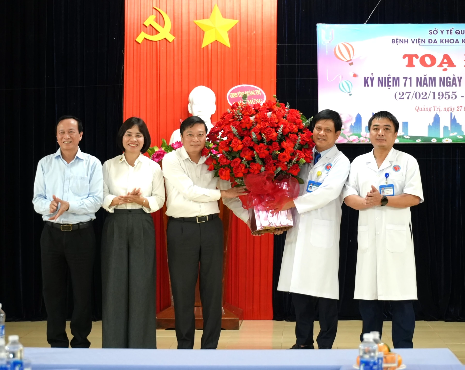 Đồng chí Chủ tịch UBND tỉnh Lê Hồng Vinh tặng hoa và gửi lời chúc tốt đẹp nhất đến cán bộ, nhân viên Bệnh viện đa khoa khu vực Đồng Hới nhân kỷ niệm 71 năm Ngày Thầy thuốc Việt Nam - Ảnh: T.Đ