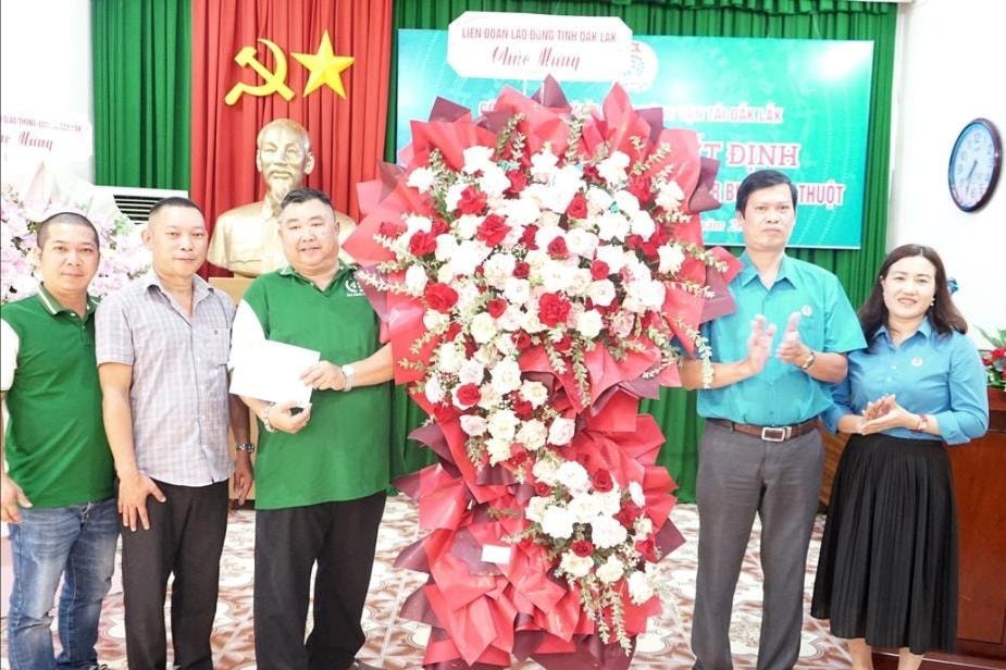 Thường trực LĐLĐ tỉnh Đắk Lắk tặng hoa, quà cho Ban chấp hành Nghiệp đoàn cơ sở Grab car Buôn Ma Thuột. Ảnh: Quốc Diễn