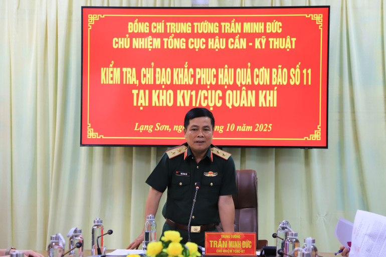 Trung tướng Trần Minh Đức chỉ đạo công tác khắc phục hậu quả cơn bão số 11 tại Kho KV1.