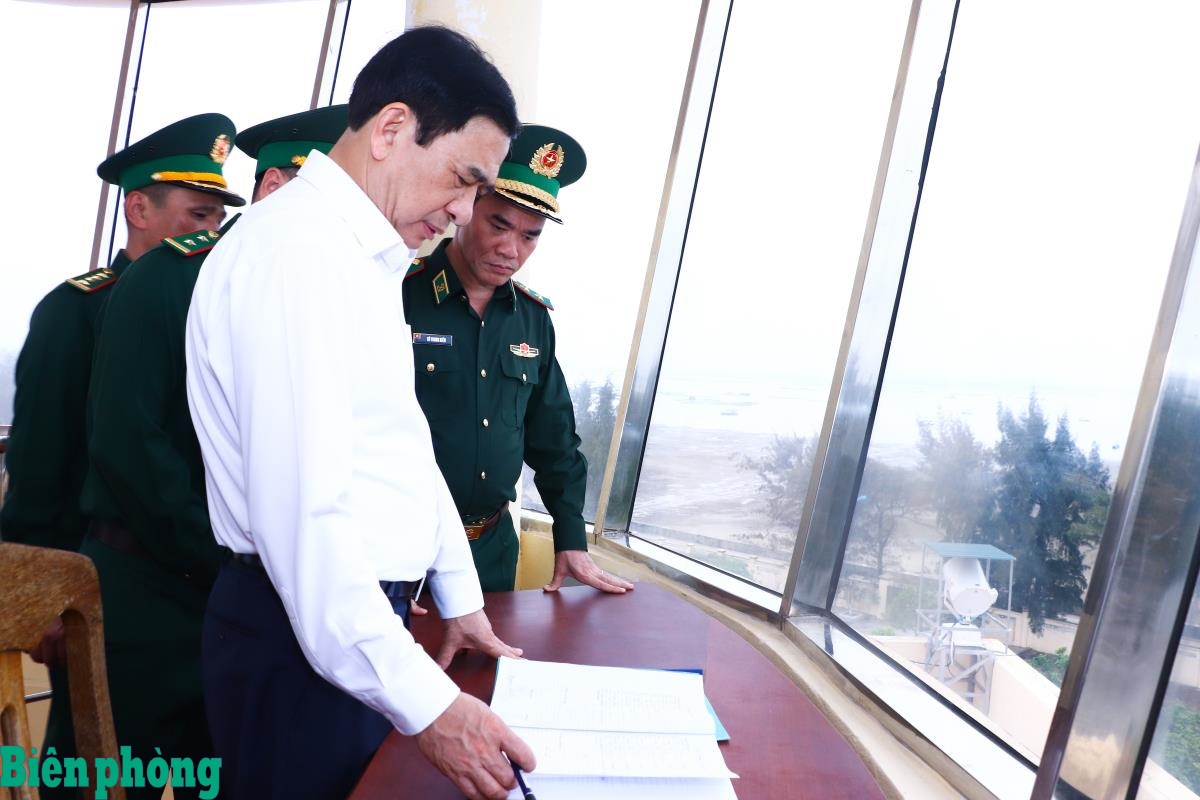 Đại tướng Phan Văn Giang thăm, động viên cán bộ, chiến sĩ Đài quan sát Tràng Vĩ, Đồn Biên phòng Trà Cổ. Ảnh: Thanh Xuân