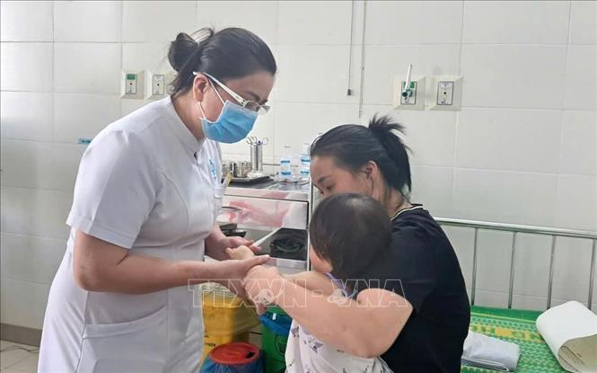 Y tá Bệnh viện Sản - Nhi Quảng Ngãi kiểm tra cho trẻ bị bệnh tay chân miệng.