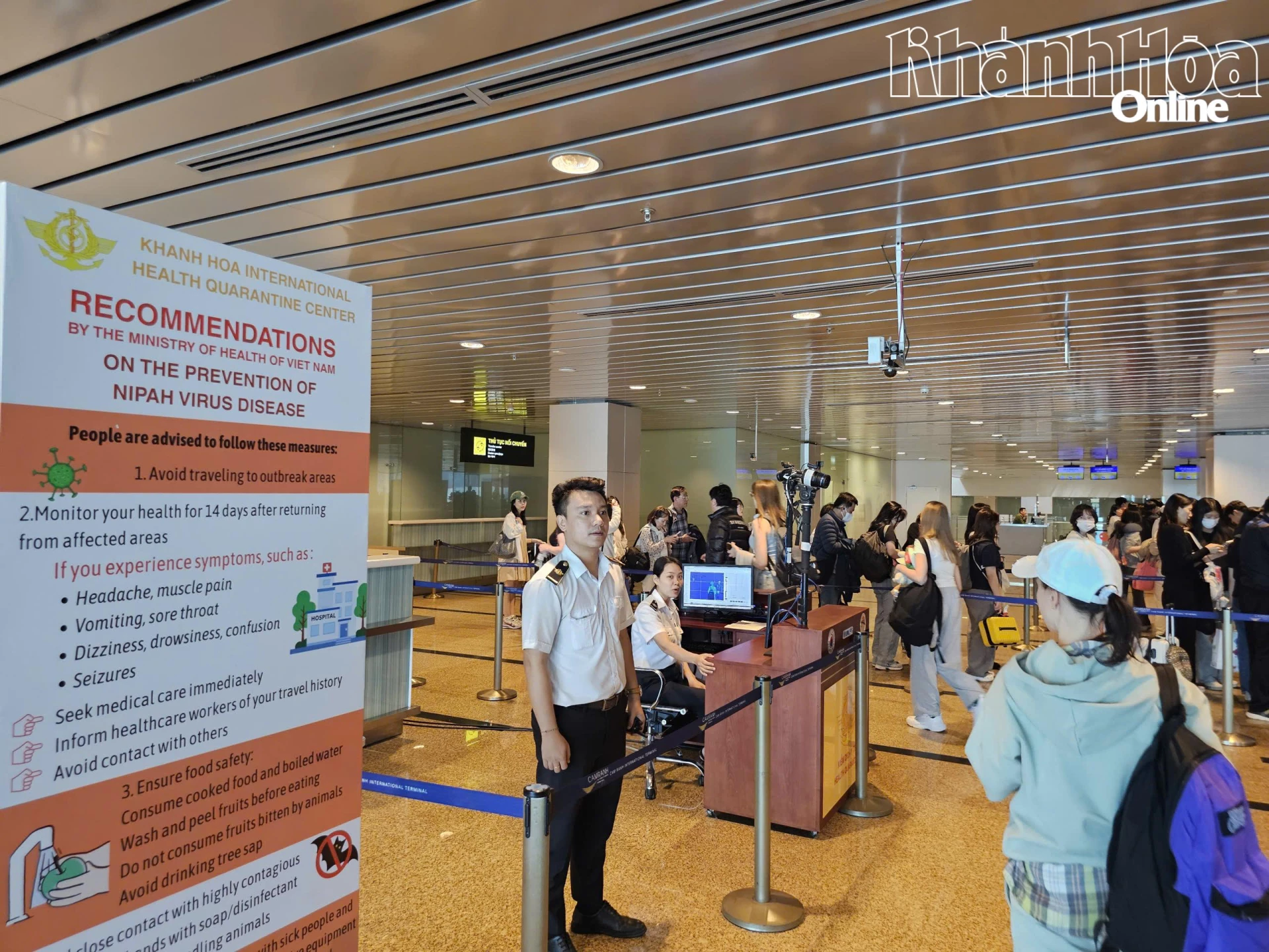 Ngay khi xuất hiện thông tin về các ca bệnh do vi rút Nipah, công tác kiểm dịch y tế tại cửa khẩu Sân bay quốc tế Cam Ranh được ngành y tế tăng cường ở mức cao nhất, với 7 máy đo thân nhiệt từ xa được lắp đặt tại các luồng di chuyển của hành khách và lực lượng kiểm dịch y tế túc trực 24/24 giờ, bảo đảm kiểm soát chặt chẽ tất cả các chuyến bay và hành khách nhập cảnh vào địa bàn tỉnh. Cùng với đó, các biển cảnh báo, bảng thông tin tuyên truyền về phòng, chống dịch bệnh với nhiều thứ tiếng được bố trí tại nhiều vị trí dễ quan sát trong khu vực sân bay. Hàng nghìn lượt hành khách xuất, nhập cảnh được kiểm dịch y tế, khai báo tình trạng sức khỏe theo quy định.