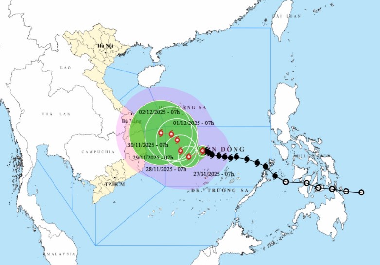 Hồi 7 giờ ngày 27/11, vị trí tâm bão ở vào khoảng 13,0 độ Vĩ Bắc; 114,2 độ Kinh Đông, cách đảo Song Tử Tây khoảng 180 km về phía Bắc. Sức gió mạnh nhất vùng gần tâm bão mạnh cấp 12 (118-133 km/h), giật cấp 15. Di chuyển theo hướng Tây Tây Bắc, tốc độ 10-15km/h.