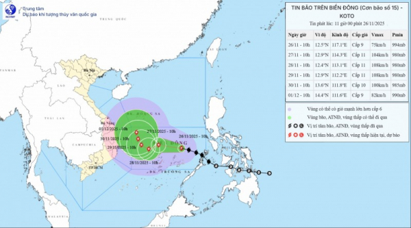 Vùng ven biển các tỉnh từ Đà Nẵng đến Lâm Đồng từ ngày 29/11 có gió mạnh cấp 8, giật cấp 10, sóng biển cao 3-5m, biển động mạnh. Vùng ven biển từ Đà Nẵng đến Lâm Đồng có thể mưa lớn 150- 250mm trong khoảng ngày 29/11 đến 1/12. Theo số liệu phân tích đến hiện tại thì khả năng cao mưa không cực đoan như đợt mưa 16-21/11.