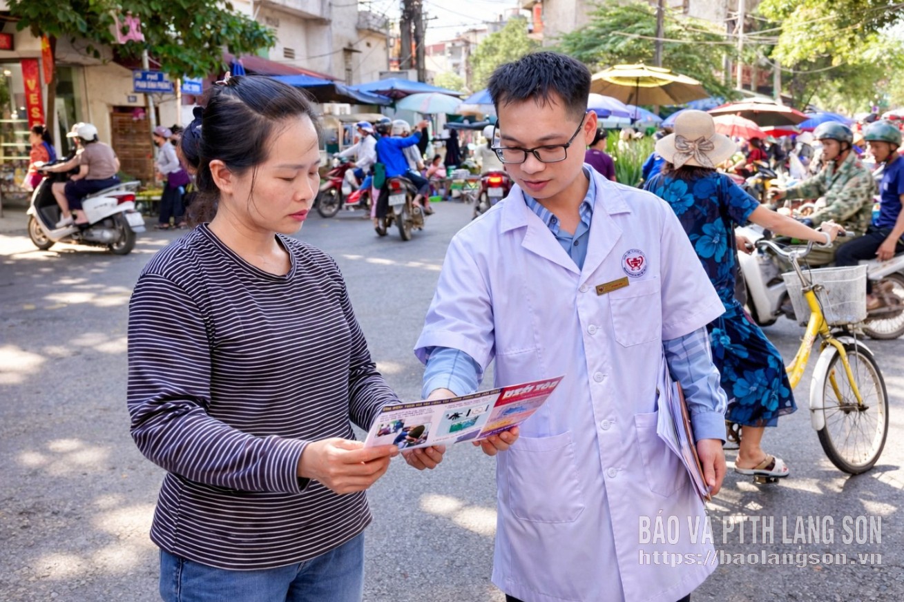 Cán bộ Trạm Y tế phường Kỳ Lừa tuyên truyền cho người dân về an toàn thực phẩm, phòng chống dịch bệnh