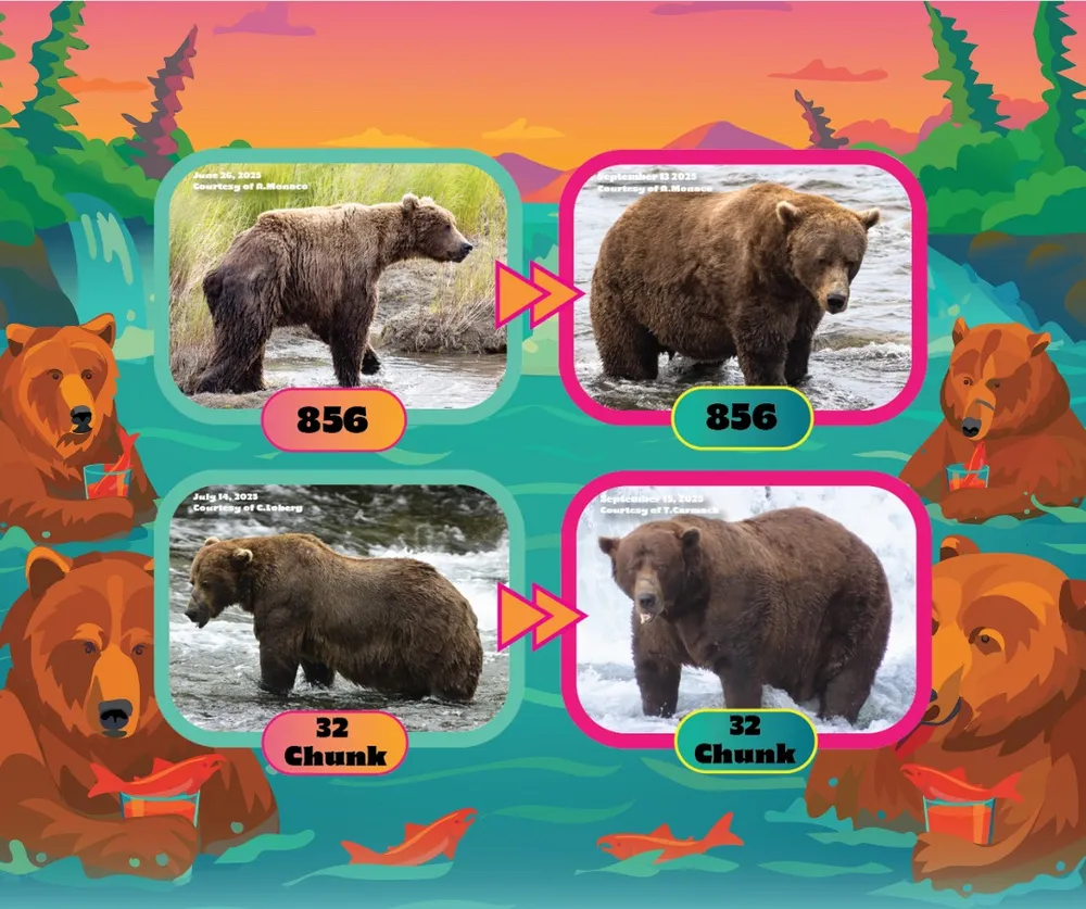 Sự thay đổi thể hình ngoạn mục của 2 "thí sinh" mang số báo danh 856 và số báo danh 32 tranh tài tại vòng chung kết Tuần lễ Gấu béo. Ảnh: FACEBOOK/Katmai National Park & Preserve