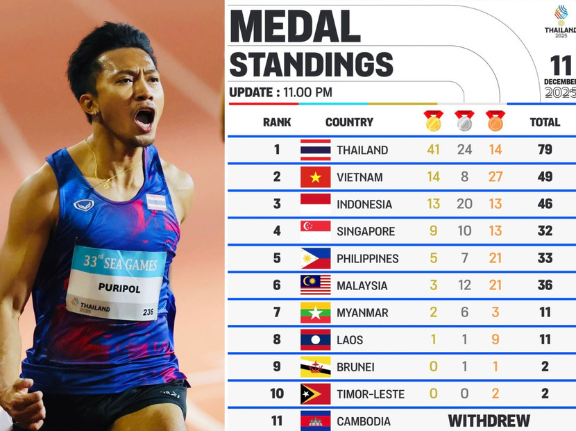Ở ngày thi đấu chính thức thứ hai của SEA Games 33, Thái Lan giành thêm 22 huy chương vàng, trong đó đáng chú ý nhất là huy chương vàng nội dung chạy 100m nam môn điền kinh - nơi "thần đồng" 19 tuổi của nước chủ nhà là Puripol Boonson tỏa sáng.