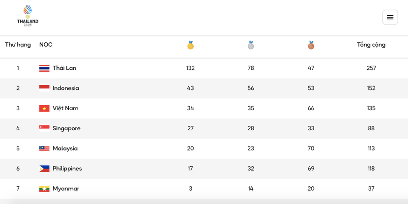 Theo đó, Indonesia xếp ngay sau Thái Lan song mới có 43 huy chương vàng, Việt Nam - 34 huy chương vàng, Singapore - 27, Malaysia - 20, Philippines - 17... Hai đoàn chưa có huy chương vàng là Brunei và Timor Leste.