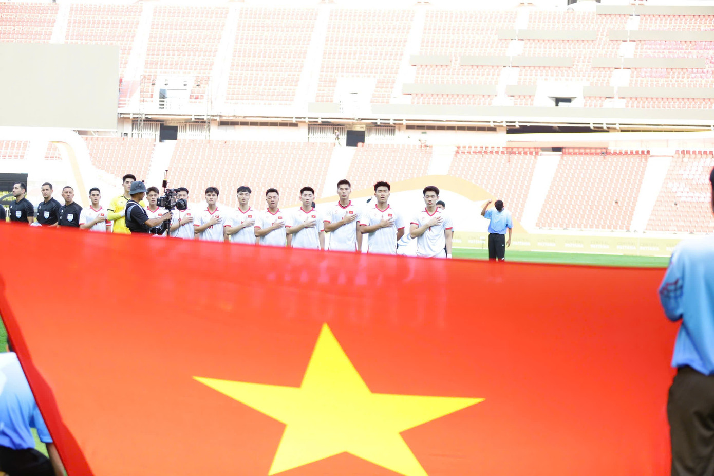 Các cầu thủ U22 Việt Nam hát Quốc ca không nhạc trong trận ra quân.