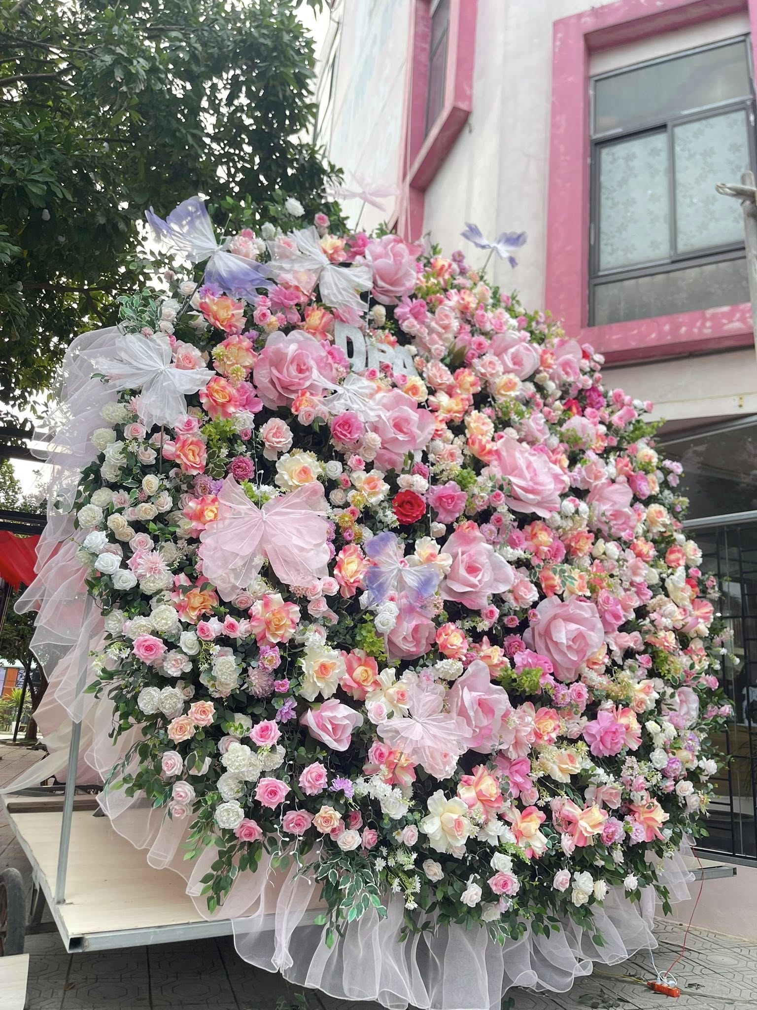 Những bông hoa lớn do các cô sáng tạo bằng cách cắt dán từ giấy dầu, và hơn 100 bông hoa hồng nhỏ là hoa lụa đặt mua. Tổng cộng, bó hoa có khoảng 200 bông lớn nhỏ.