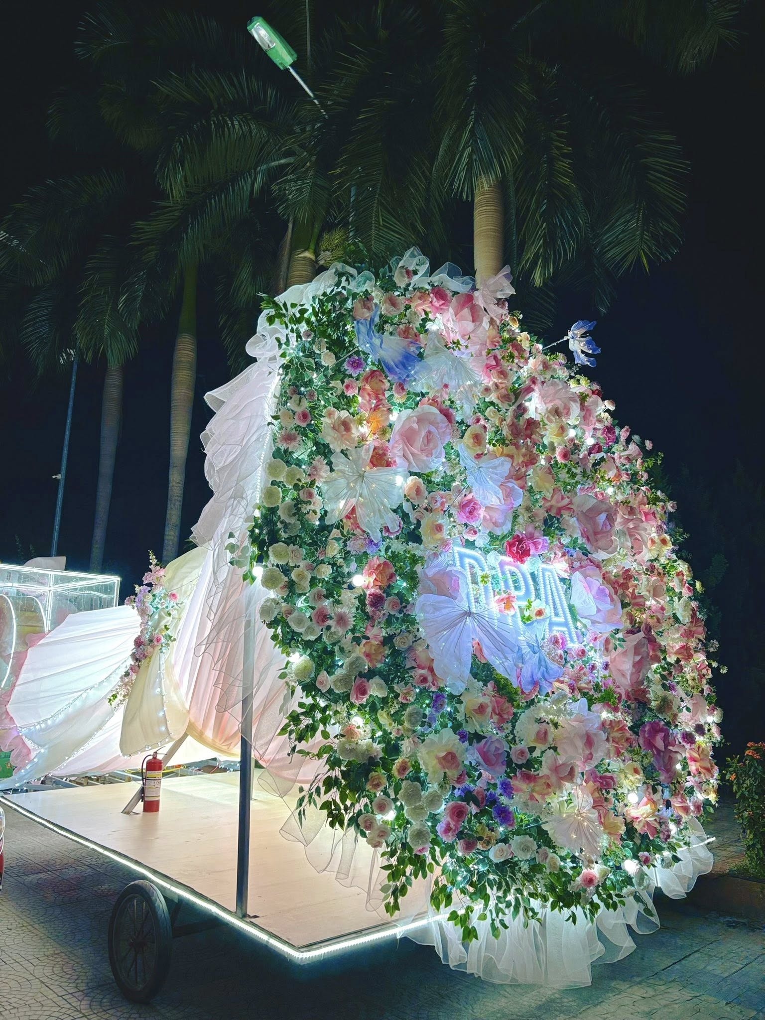 "Tối hôm qua khi đi rước qua các tuyến đường quanh TP Thái Nguyên cũ, đèn chỉ mới hoàn thiện khoảng 80%. Hôm nay, các cô đã chỉnh trang, thêm thắt để bó hoa rực rỡ hơn", người đại diện nói.