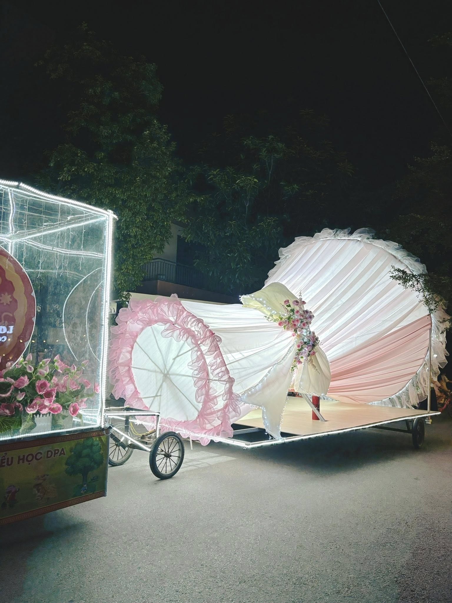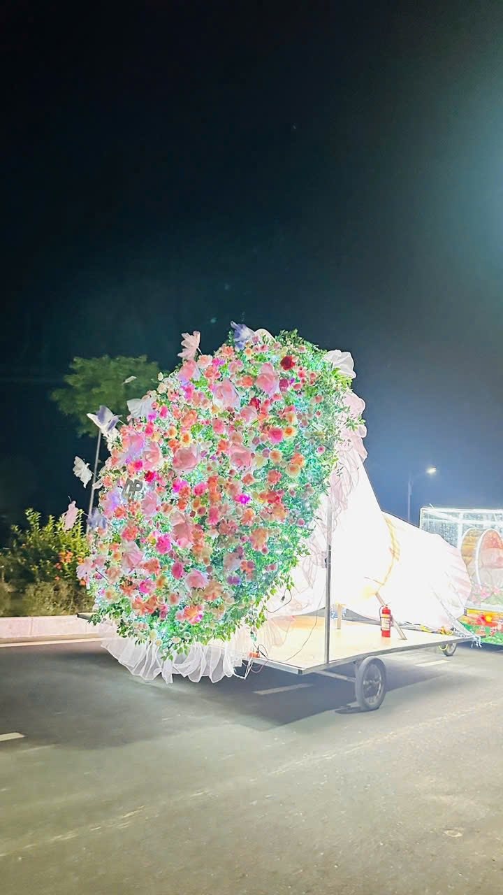 Tối 3/10, hình ảnh đèn lồng hình bó hoa khổng lồ diễu qua đường phố ở Thái Nguyên khiến những người qua đường phải ngoái nhìn vì quá ấn tượng. Bó hoa với tông màu hồng chủ đạo, với ánh đèn nhấp nháy lướt qua làm ai nấy đều "trầm trồ".