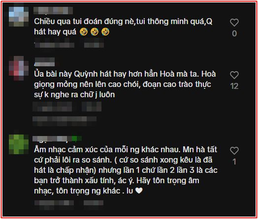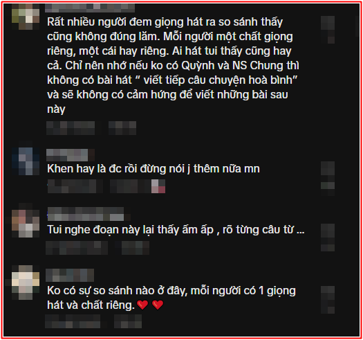 Cả Hòa Minzy và Nguyễn Duyên Quỳnh đều là hai giọng ca được đánh giá cao về kỹ thuật lẫn cảm xúc. Việc họ cùng thể hiện những sáng tác giàu tính nhân văn của Nguyễn Văn Chung không chỉ tạo nên sự so sánh thú vị, mà còn là dấu hiệu tích cực cho thấy những ca khúc về hòa bình, nhân sinh vẫn đang được khán giả đón nhận mạnh mẽ.