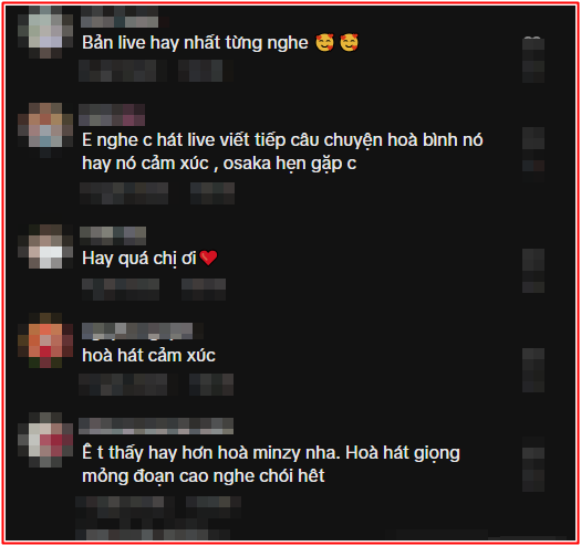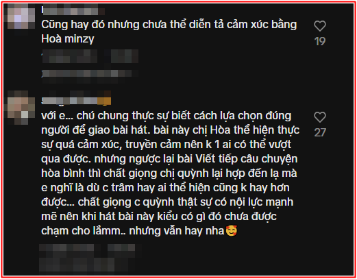 Điểm chung trong số lượng lớn bình luận là sự tôn trọng dành cho cả hai giọng ca. Nhiều khán giả cho rằng chính nhạc sĩ Nguyễn Văn Chung đã "chọn đúng người đúng bài": Hòa Minzy truyền cảm xúc cho Nỗi đau giữa hòa bình, còn Nguyễn Duyên Quỳnh lại đưa Viết tiếp câu chuyện hòa bình đến sâu trong lòng công chúng.