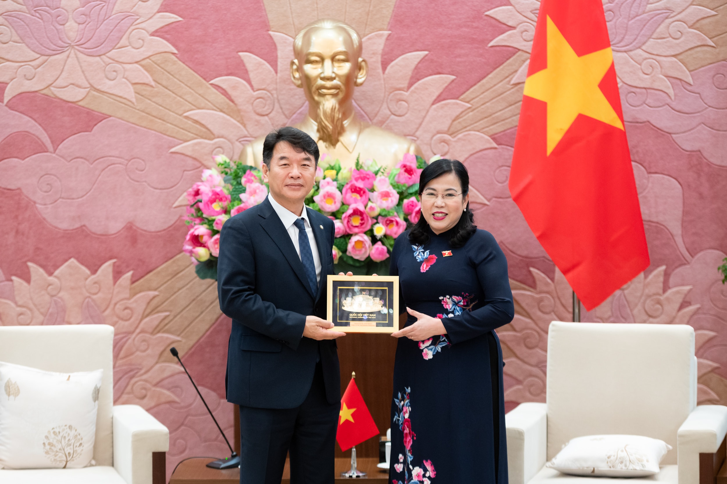 Chủ nhiệm Ủy ban Khoa học, Công nghệ và Môi trường Nguyễn Thanh Hải tặng quà lưu niệm Chủ tịch Nhóm Nghị sĩ hữu nghị Hàn Quốc - Việt Nam Moon Jin Seog