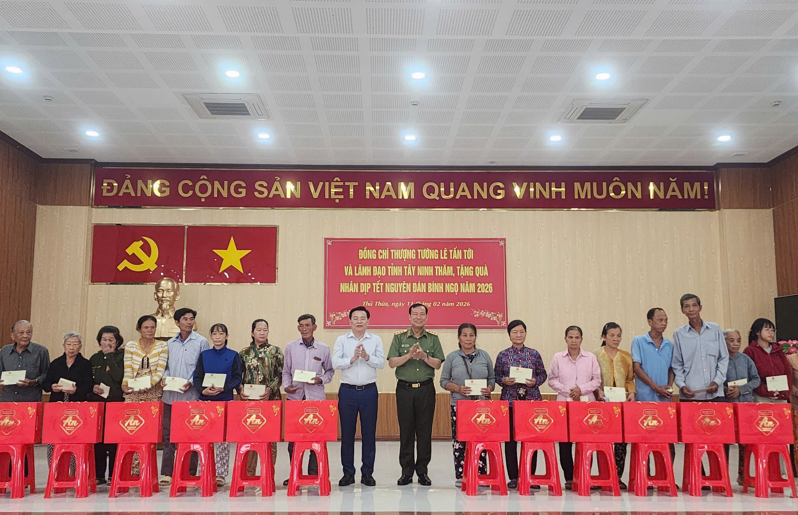 Chủ nhiệm Ủy ban Quốc phòng, An ninh và Đối ngoại, Thượng tướng Lê Tấn Tới và Chủ tịch Ủy ban MTTQ Việt Nam tỉnh Tây Ninh Nguyễn Thanh Hải tặng quà Nhân dân xã Thủ Thừa