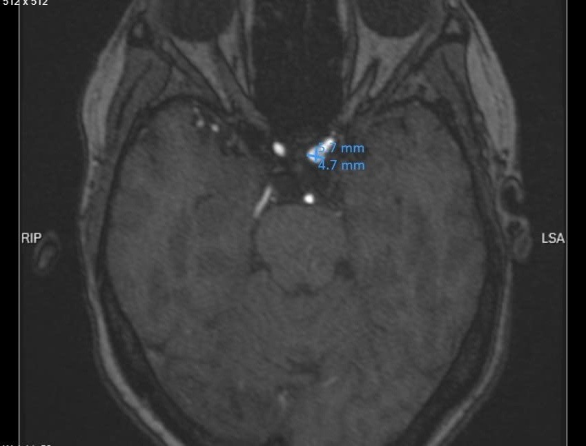 Qua thăm khám lâm sàng, các bác sĩ đã chỉ định chụp cộng hưởng từ mạch máu não. Kết quả ghi nhận bệnh nhân có túi phình mạch tại đoạn siphon của động mạch cảnh trong trái, kích thước khoảng 5 - 6 mm, thuộc nhóm túi phình mạch não kích thước trung bình.