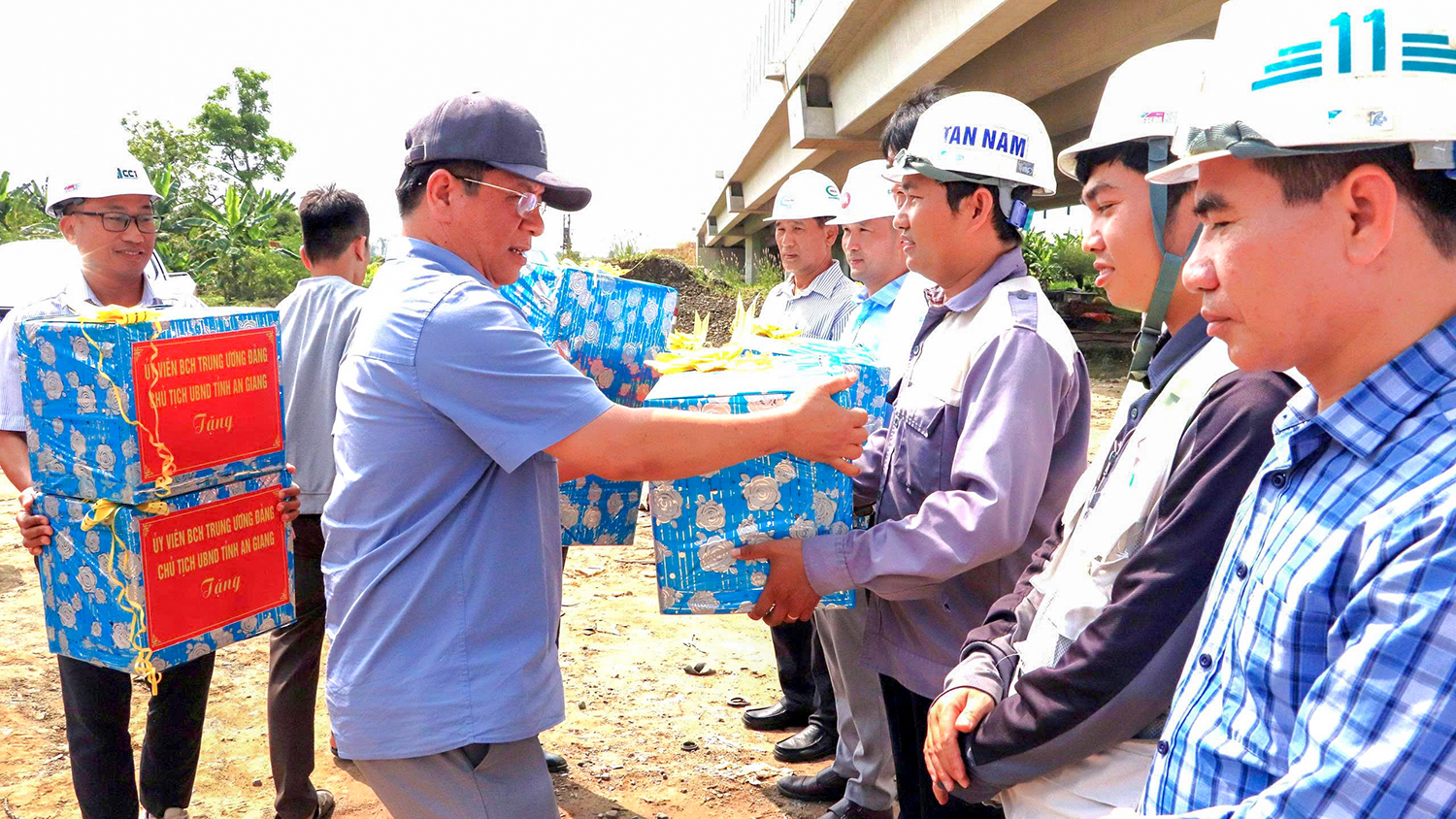 Ông Hồ Văn Mừng tặng quà, động viên lực lượng kỹ sư, công nhân, người lao động đang thi công tại công trường. Ảnh: Cổng TTĐT An Giang