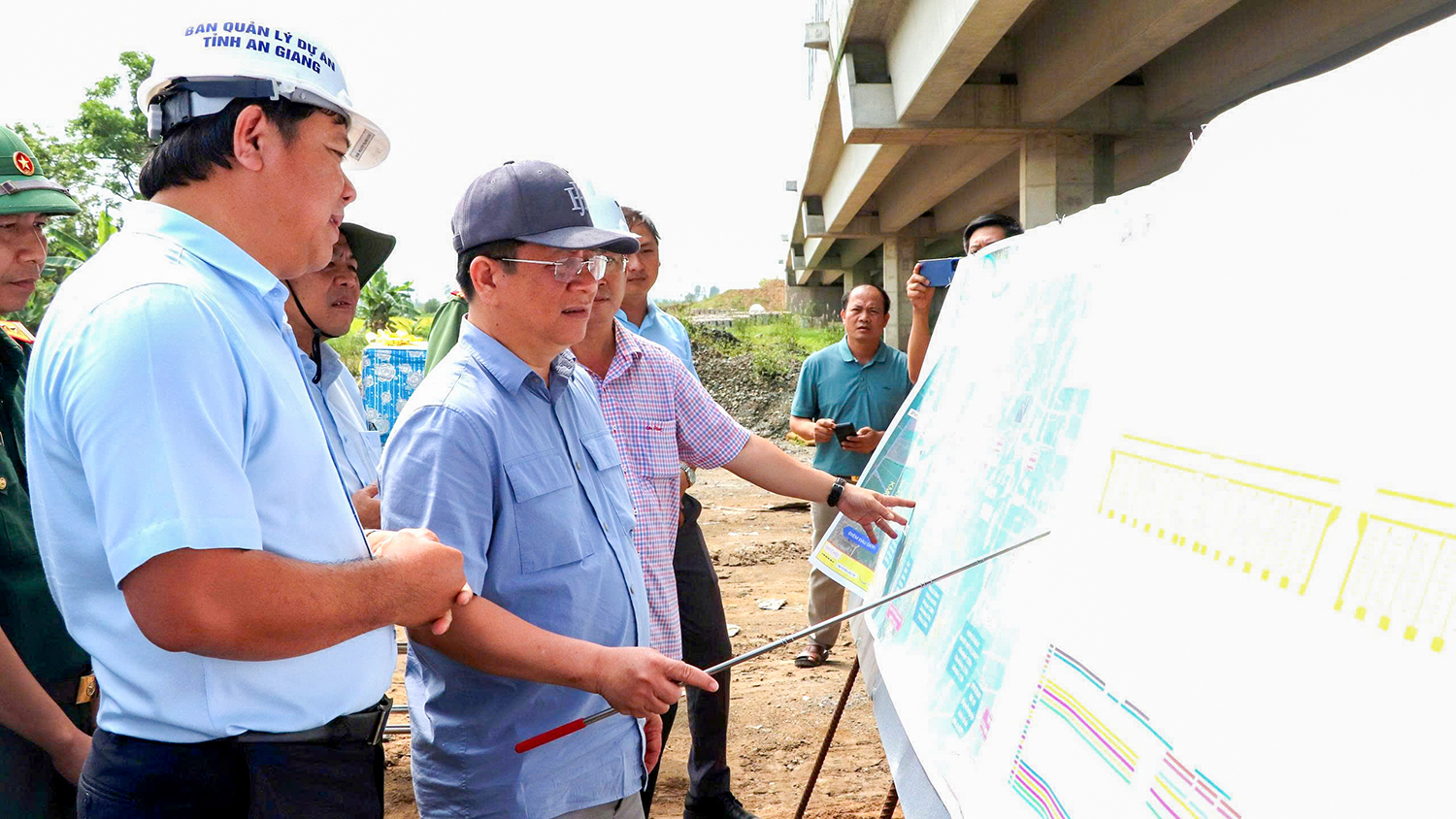 Ông Hồ Văn Mừng, Chủ tịch UBND tỉnh An Giang dẫn đầu đoàn công tác đến kiểm tra công tác tổ chức thi công dự án cao tốc Châu Đốc - Cần Thơ - Sóc Trăng đoạn qua địa bàn tỉnh. Ảnh: Cổng TTĐT An Giang
